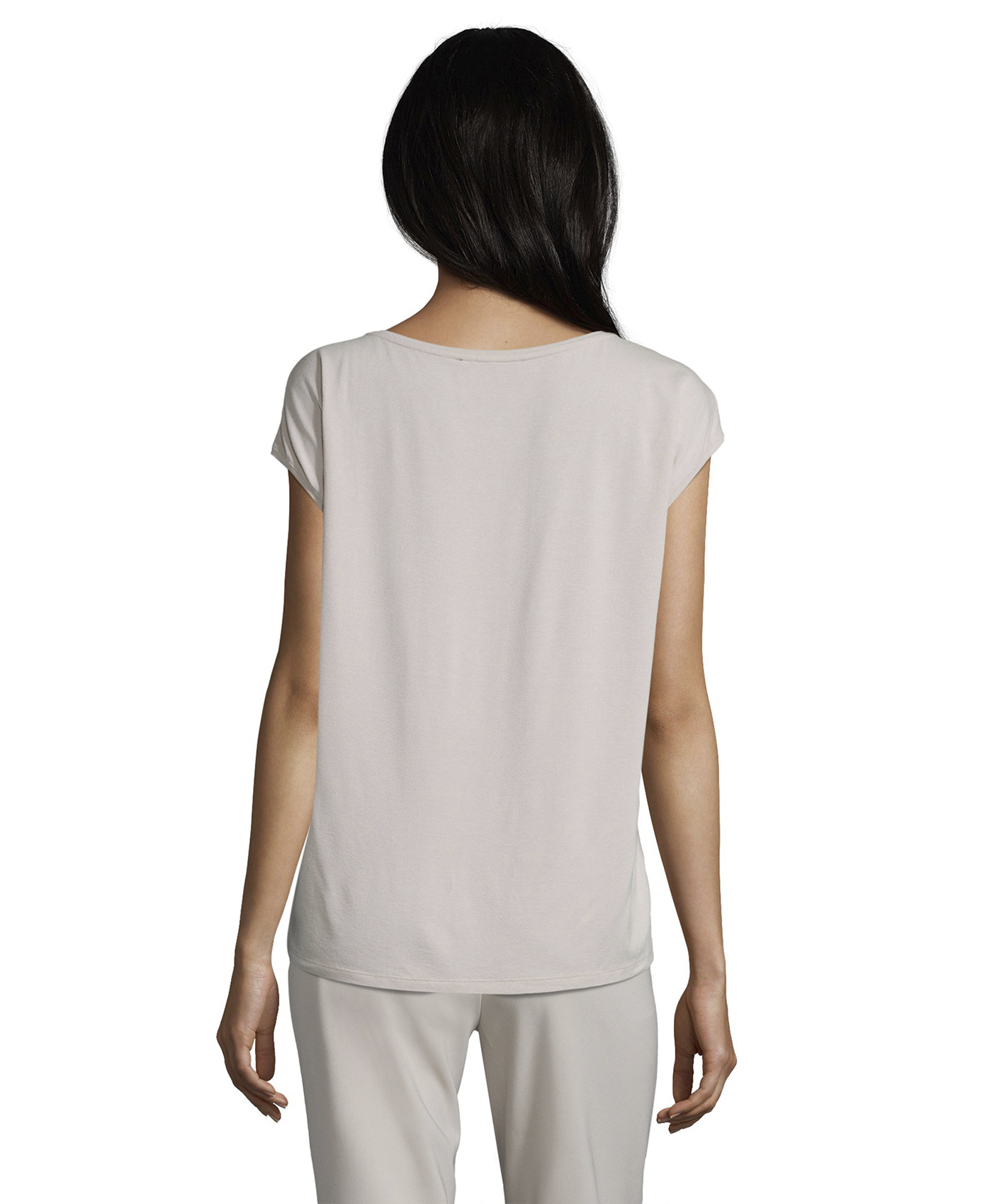 Однотонный топ - базовая модель, которая является обязательной вещью в любом гардеробе. Топ прямого покроя с вырезом-лодочкой и короткими цельнокроеными рукавами. Блестящий атласный перед изделия контрастирует с матовой спинкой. Материал из смеси шелка и эластана обеспечивает комфорт и идеально подходит для теплого времени года. В этом лаконичном и элегантном топе вы будете выглядешь шикарно, независимо от выбранного варианта низа и обуви.