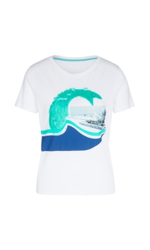 Футболка прямого кроя. Круглый вырез горловины, короткие рукава со спущенным плечом. Яркий принт, декор пайетками. Приятный к телу материал из хлопковой смеси.