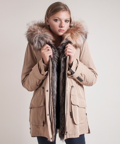 Теплая пихора на подкладке из натурального меха кролика. Плотная ткань верха. Прямой покрой, кулиска на талии. Удлиненная спинка, замки-молнии по бокам. Накладные карманы на клапанах. Рукава декорированы замками и патой на кнопке. Оторочка капюшона из натурального лисьего меха.