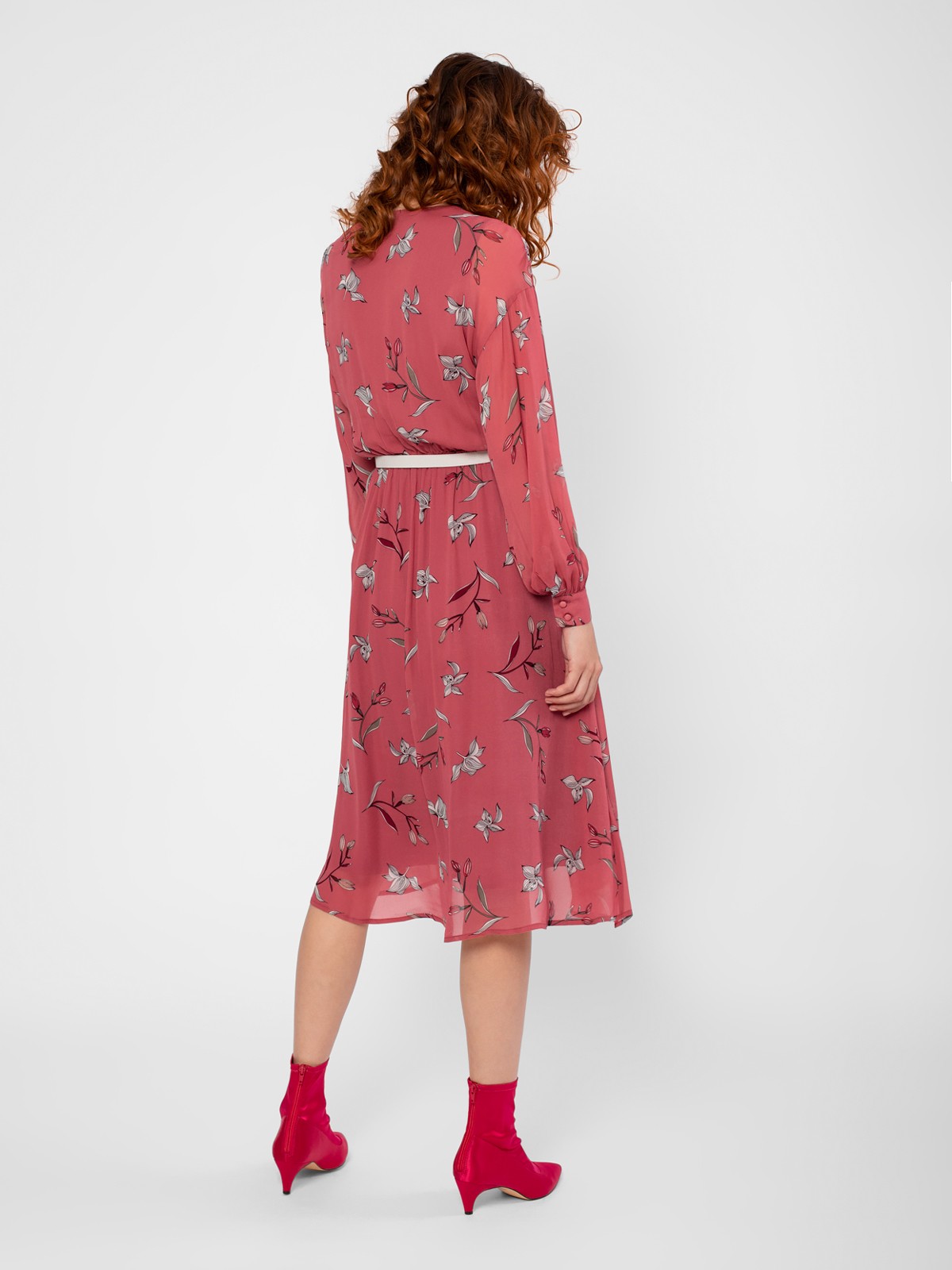 Платье из вискозы полуприлегающего силуэта с v-образным вырезом, спущенным плечом и обьемным рукавом на манжете. На талии резинка. В комплект входит узкий съемный ремень из экокожи с металлической пряжкой.