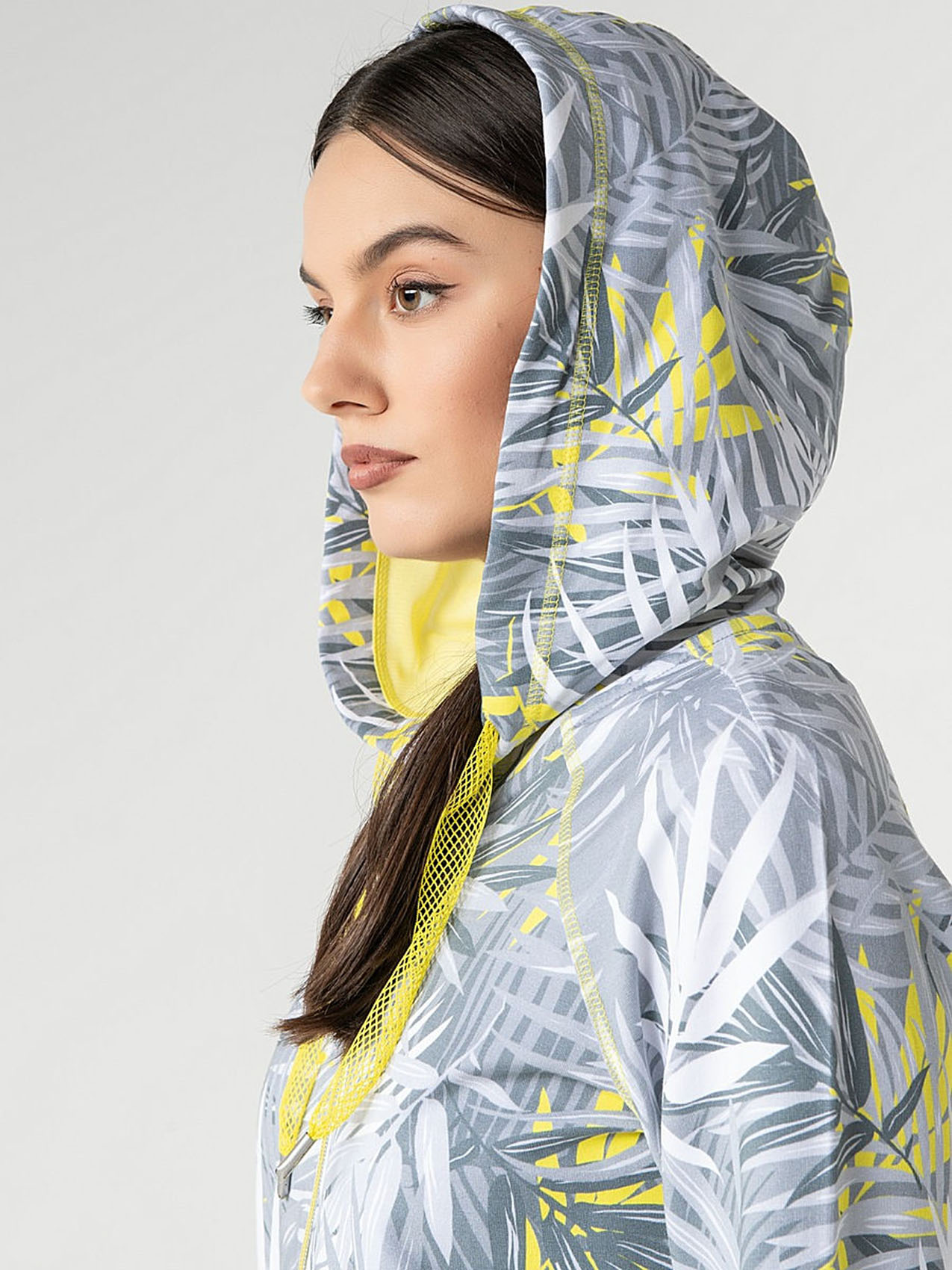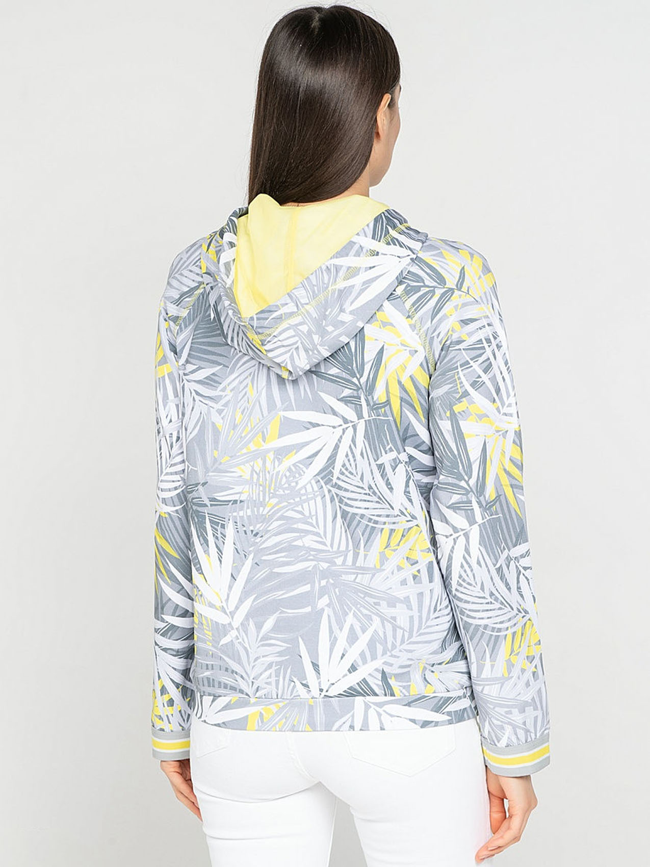 Блейзер с капюшоном. Трендовый принт с тропическими мотивами. Длинные рукава с трикотажными манжетами. Прорезные карманы. Замок-молния. Приятный к телу материал из смеси хлопка и эластана. Длина изделия по спинке: 67 см.