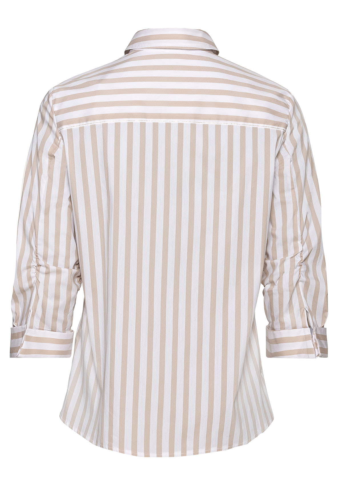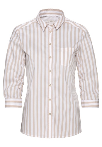 Модный фаворит - блузка Daira. С блузкой в белую и бежевую полоску вы создадите великолепный образ на каждый день. Модель состоит из приятной к телу хлопково-эластанной смеси. Заворачивающийся рукав 3/4, небольшой нагрудный карман и непрерывная пуговичная планка с матовыми золотистыми пуговицами еще больше подчеркивают вкус обладательницы. Рубашка-блузка отлично сочетается со всеми типами джинсов и благородно смотрится с брюками. • полосатая блузка • смесь хлопка, полиамида и эластана • рукава 3/4, которые можно закатать • непрерывная пуговичная планка • нагрудный карман спереди • слегка приталенный силуэт • длина около 65 см