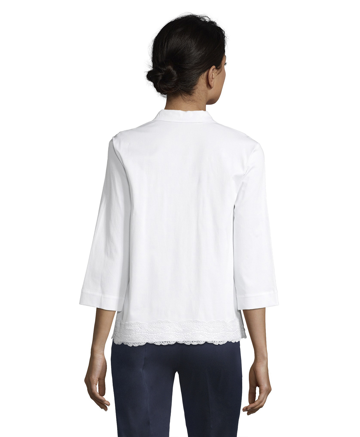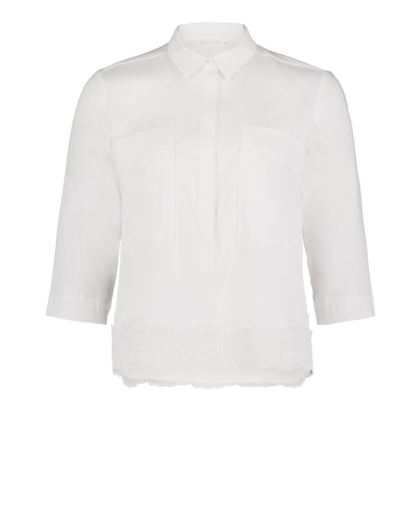 Белая блуза - это совсем не скучно! Прямой покрой, отложной воротничок, рукава 3/4, карманы на груди. Отделка кружевом по низу изделия подчеркивает женственность обладательницы блузы. Приятный к телу материал из хлопковой смеси обеспечивает комфорт. Эта элегантная блуза отлично смотрится с брюками и любой обувью.