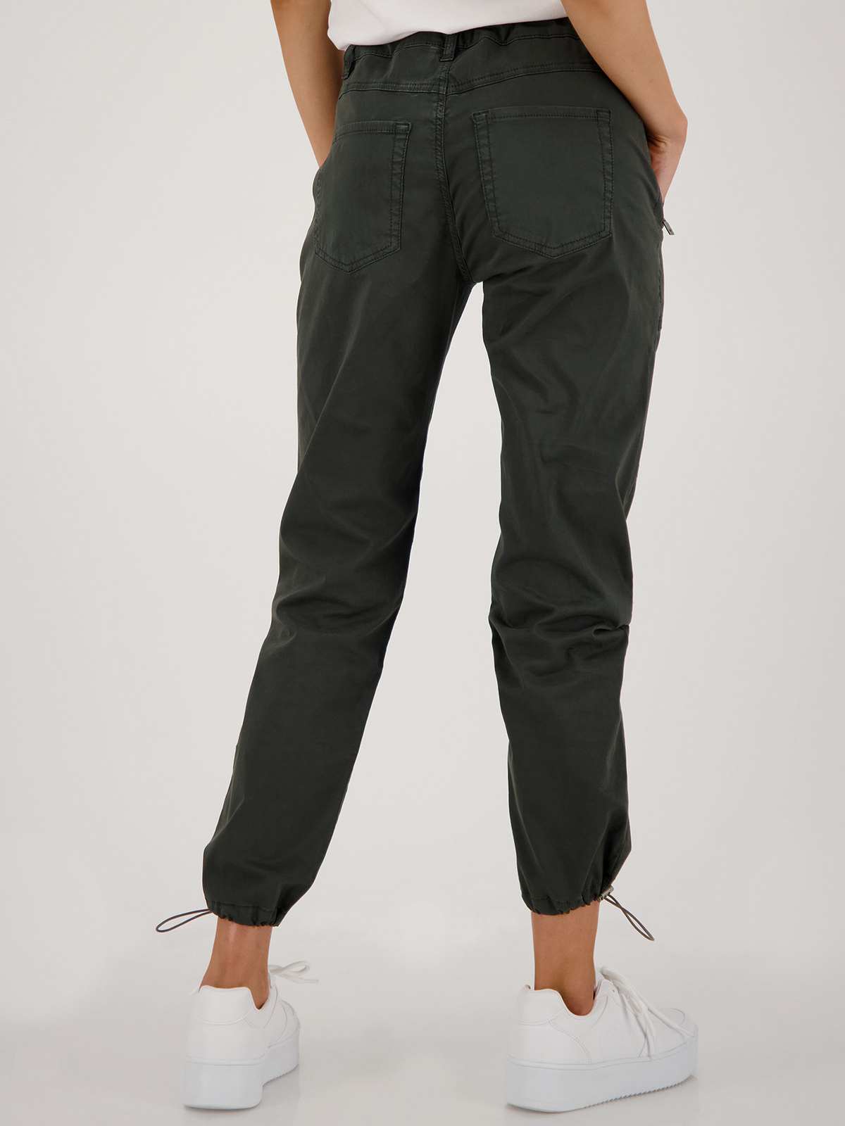 Однотонные джоггеры цвета хаки для повседневного городского образа в стиле кэжуал. Эластичный пояс с кулиской обеспечивают комфортную посадку. Объемные накладные карманы, молнии на коленях. Кулиска по низу штанин.