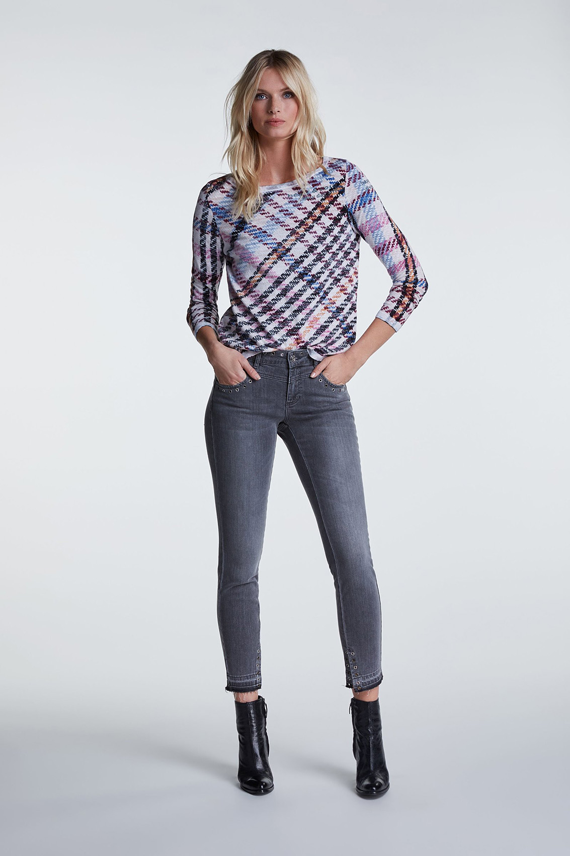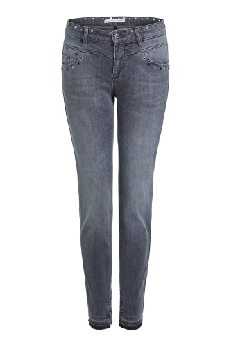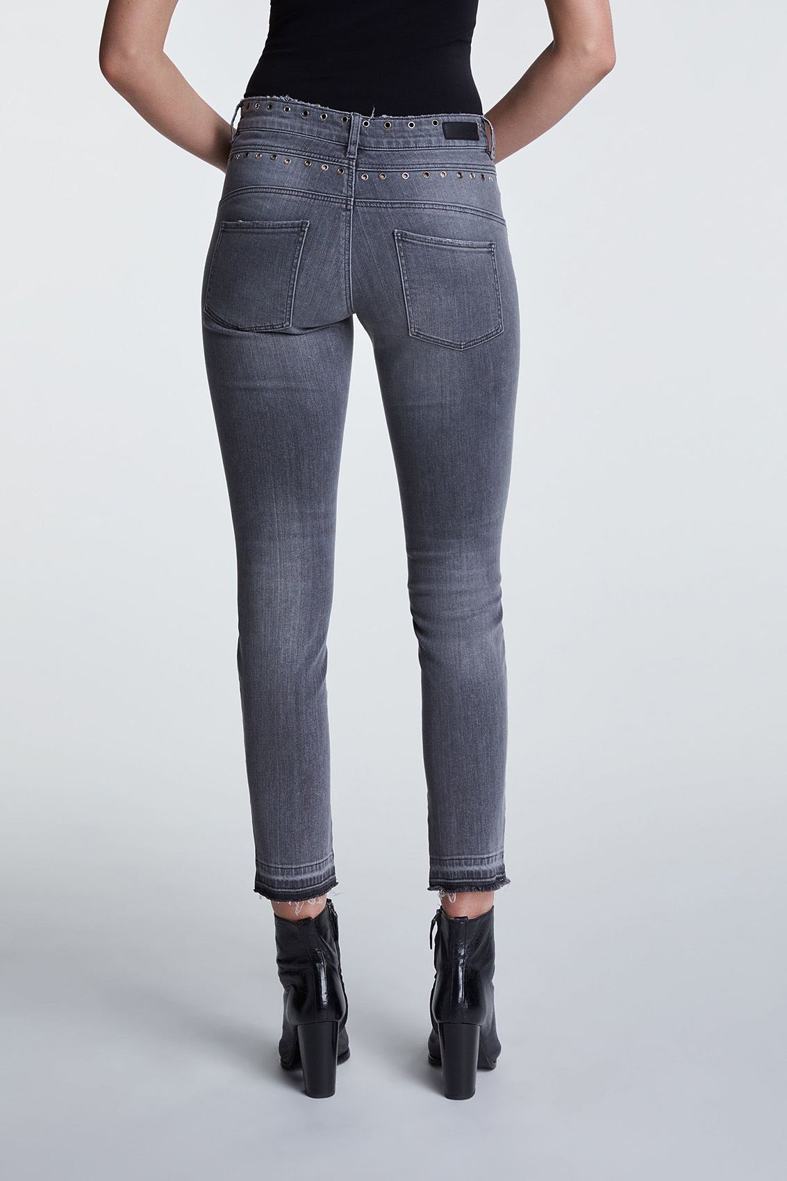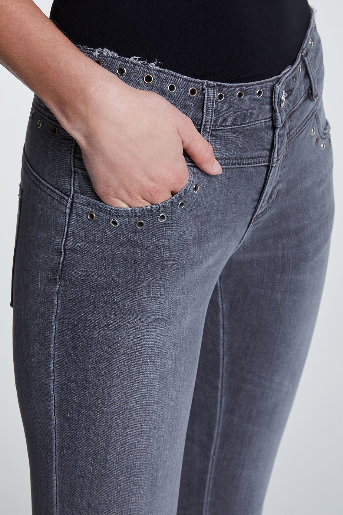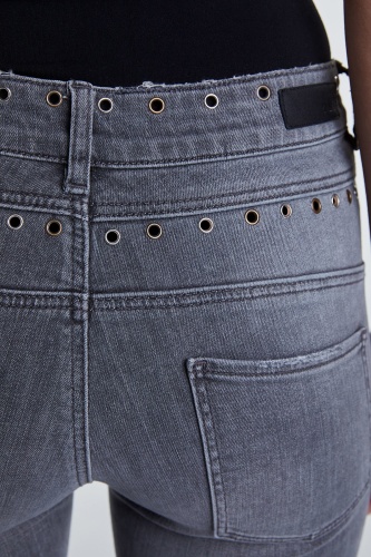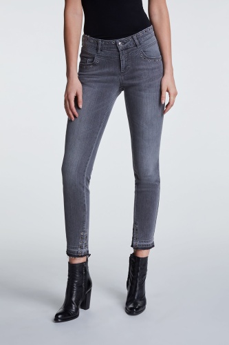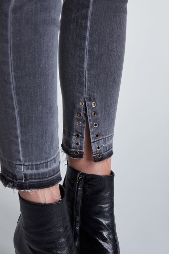 Джинсовые брюки с потертостями. Средняя посадка, силуэт slim подчеркивает стройные ноги. Укороченная длина брюк акцентирует внимание на модной обуви. Другие элементы дизайна - карманы, декоративные отверствия с люверсами, разрезы с внутренней стороны, открытый нижний срез брюк с бахромой. Приятный к телу материал из хлопковой смеси обеспечивает комфорт в ношении.