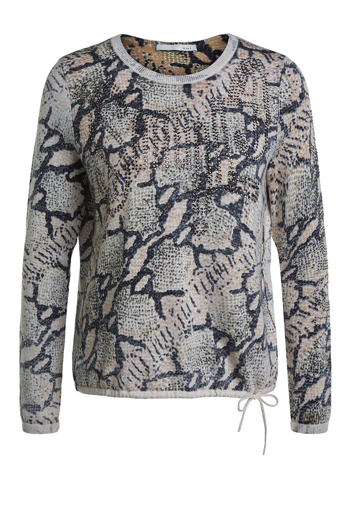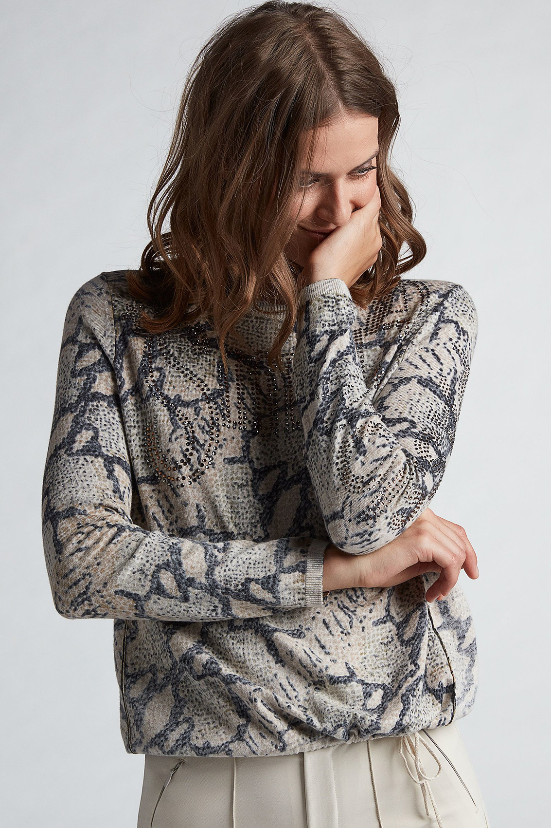Этот джемпер непременно обратит на себя внимание благодаря необычному абстрактному принту. Джемпер прямого покроя с кулиской по низу изделия. Горловина-лодочка, длинные рукава. Декор стразами придает гламурный блеск. Хлопковый материал приятен к телу и обеспечивает комфорт. В сочетании с лаконичным низом джемпер создает стильный современный образ.