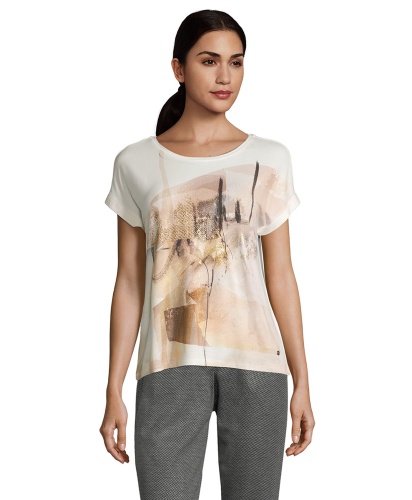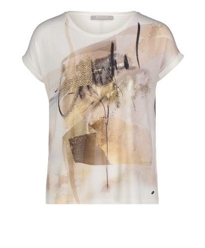 Топ с абстрактным принтом создает яркий образ. Прямой покрой, круглый вырез горловины, короткие рукава с фиксированными манжетами. Спинка изделия выполнена из однотонного материала с металлизированным принтом. Приятный к телу материал из вискозной смеси обеспечивает комфорт. Этот топ прекрасно смотрится в любом комплекте одежды.