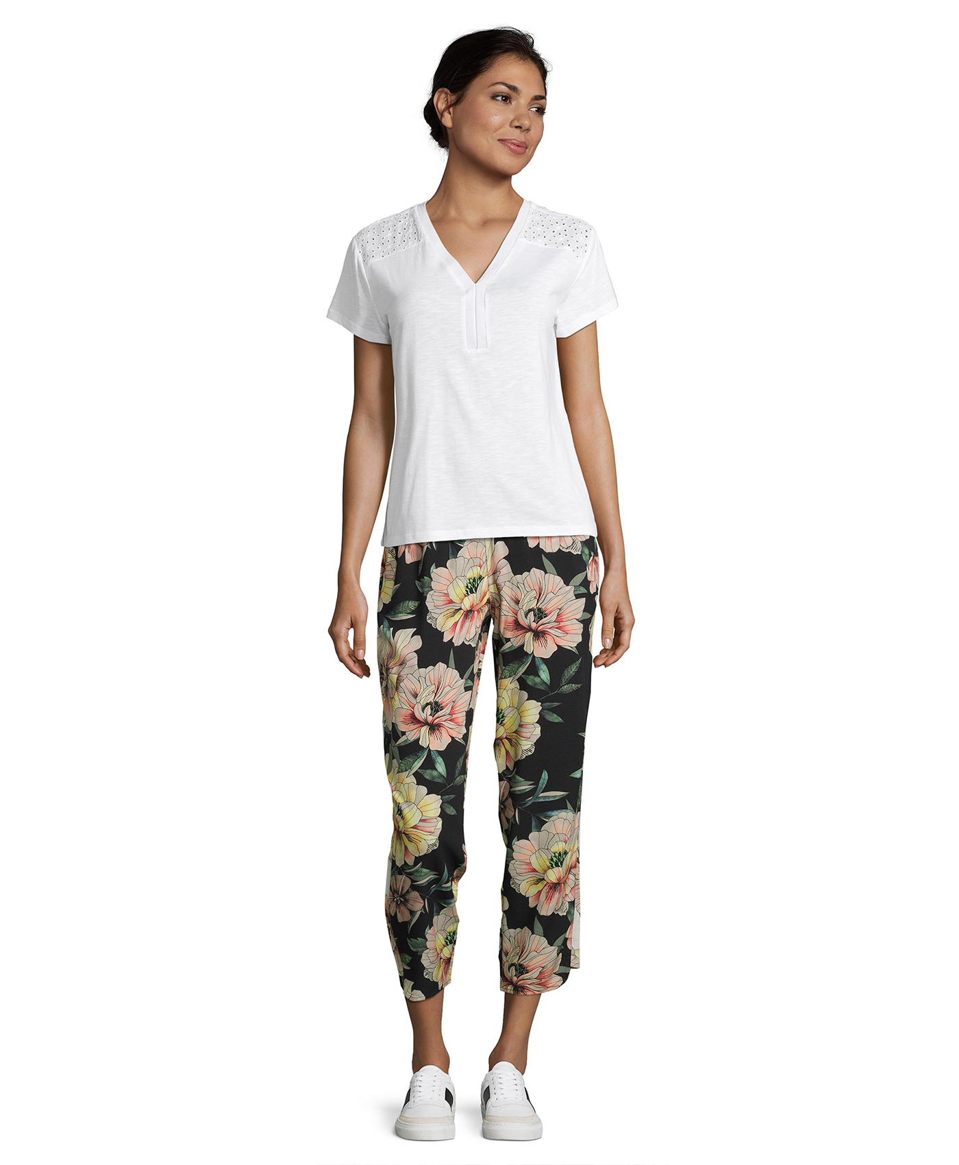 Эта стильная футболка создает романтический образ. Прямой покрой, V-образный вырез, короткие рукава, удлиненная спинка изделия. Ажурные вставки на кокетке переда и спинки изделия подчеркивают женственность обладательницы футболки. Материал из смеси хлопка и модала приятен к телу и обеспечивает комфорт. Эта футболка отлично сочетается как с брюками, так и с юбкой.