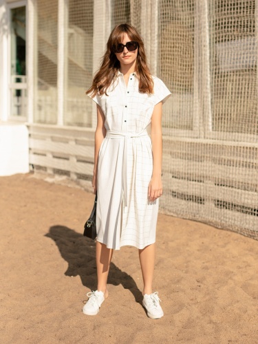 Платье из вискозной смеси в принте прямого силуэта с коротким рукавом кимоно, отложным воротником и застежкой спереди на пуговицы. В комплект входит съемный пояс из основной ткани. Спереди накладной карман прямоугольной формы.