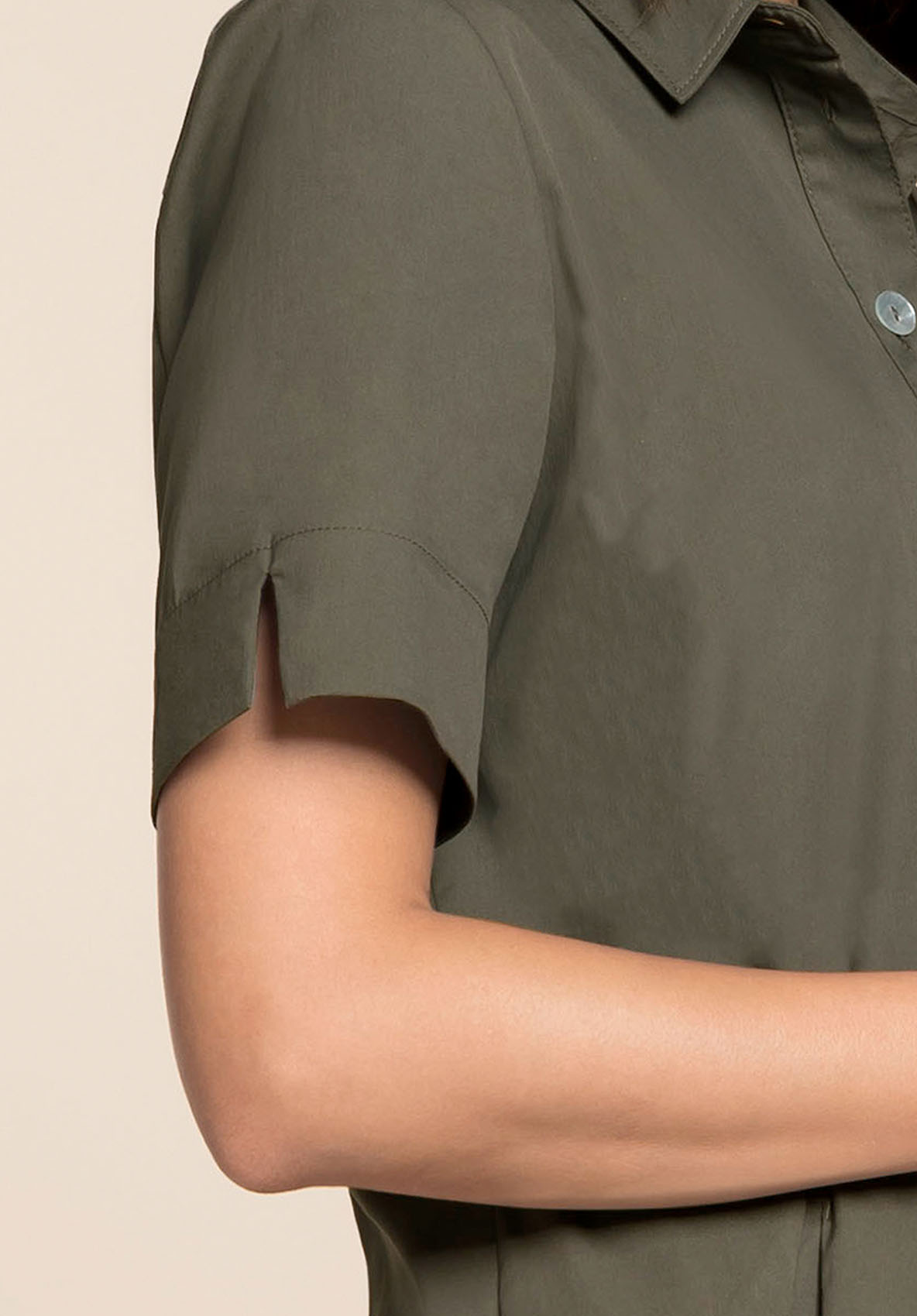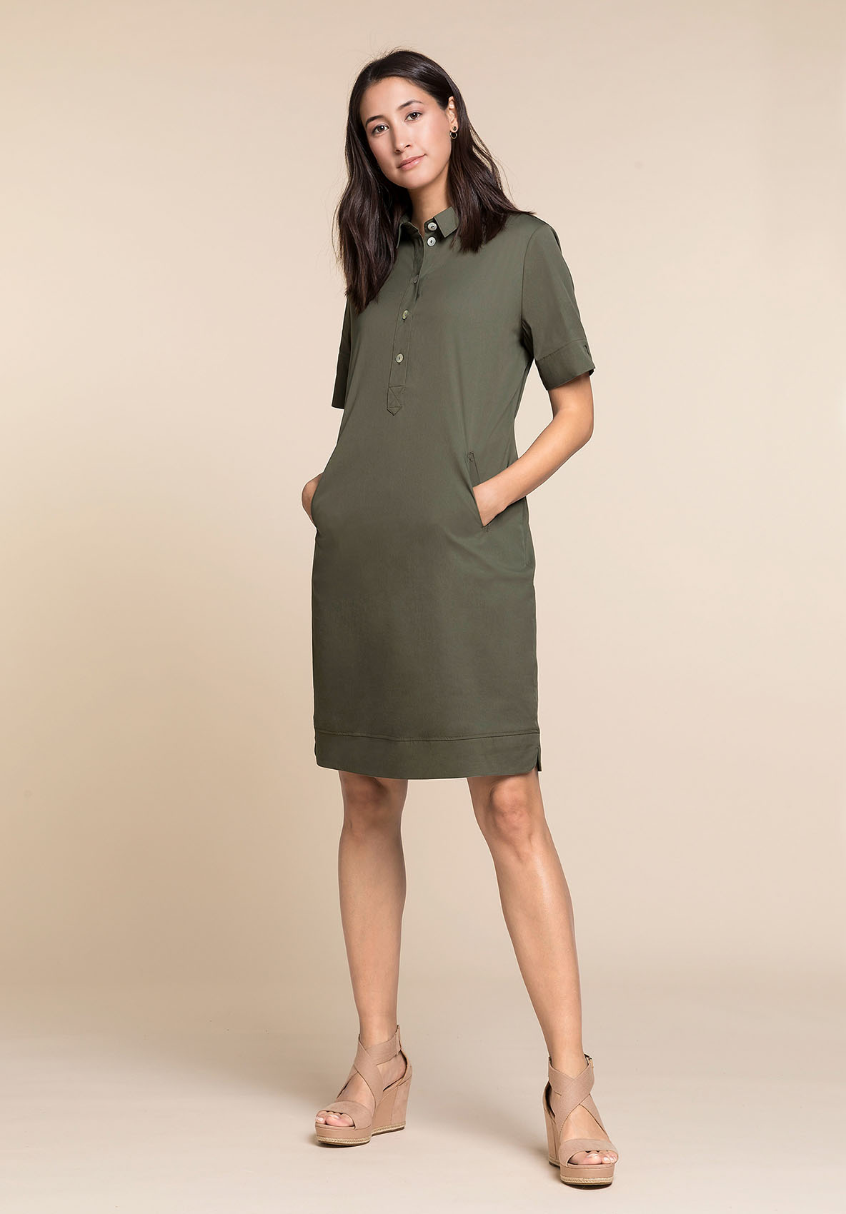Платье-рубашка Dorine представлено в актуальном трендовом цвете. Изготовленное из эластичной смеси хлопка и полиамида, платье легкое и приятное к телу. Спортивное платье-рубашка с карманами и стильными перламутровыми пуговицами, Dorine идеально подходит для повседневного образа. • платье-рубашка с пуговичной планкой и воротником поло • эластичная смесь хлопка и полиамида • прорезные карманы, рукав 1/2, прямой крой • длина юбки около 56 см, рост модели около 180 см • при росте 168 см платье будет до середины колен