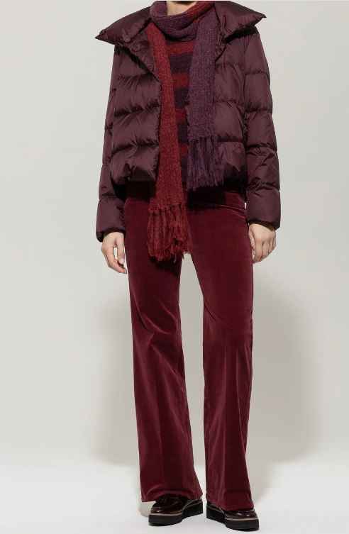 Женская бордовая куртка прямого кроя. Высокий воротник-стойка обеспечивает дополнительное тепло и уют. Регулярный узор горизонтальных стежков придает изделию аккуратный вид и объем. Прямые рукава доходят до запястий, обеспечивая свободу движений. Легкий блеск материала добавляет изысканности общему виду. Отличный выбор для создания стильного и функционального зимнего образа.