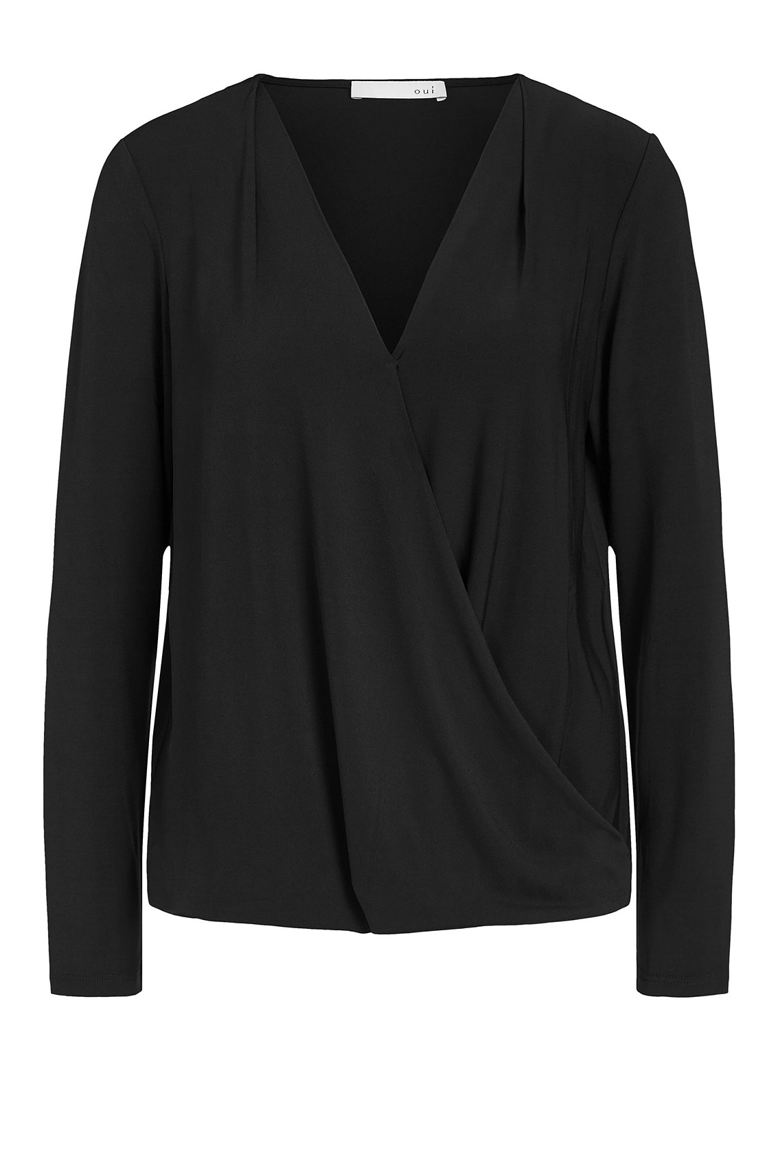 Однотонная блуза прямого покроя - обязательный элемент базового гардероба. Втачные рукава полной длины. V-образный вырез с имитацией запаха создает элегантный и женственный образ.