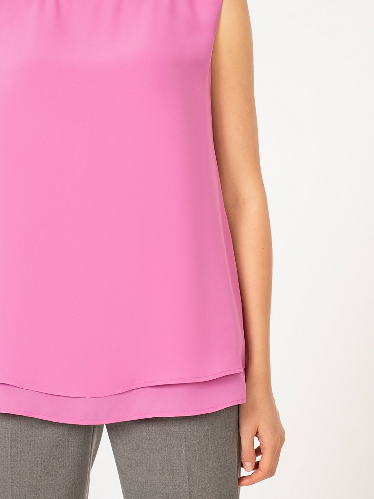 Блуза без рукавов в нежном розовом оттенке. Прямой крой идеально подходит для любого типа фигуры. Овальный вырез горловины подчеркивает линию шеи. Блузу предпочтительно носить навыпуск с брюками.