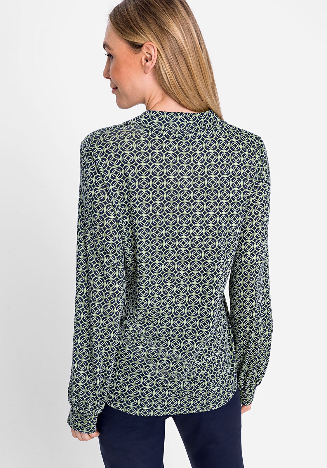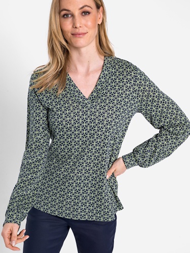 Блуза с геометрическим узором по всей поверхности изделия. Женственный V-образный вырез горловины, прямой крой. Длинные втачные рукава с манжетами. Блузу можно носить как навыпуск, так и заправленной в брюки или юбку-миди.