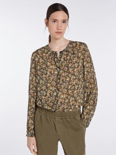 Блузка с красивым узором в стиле кэжуал. 100% экологически чистый вискозный шифон. Цветочный принт по всей поверхности. Круглый вырез и планка на потайных пуговицах. Полупрозрачный материал. Длина 42 российского размера: 64 см.