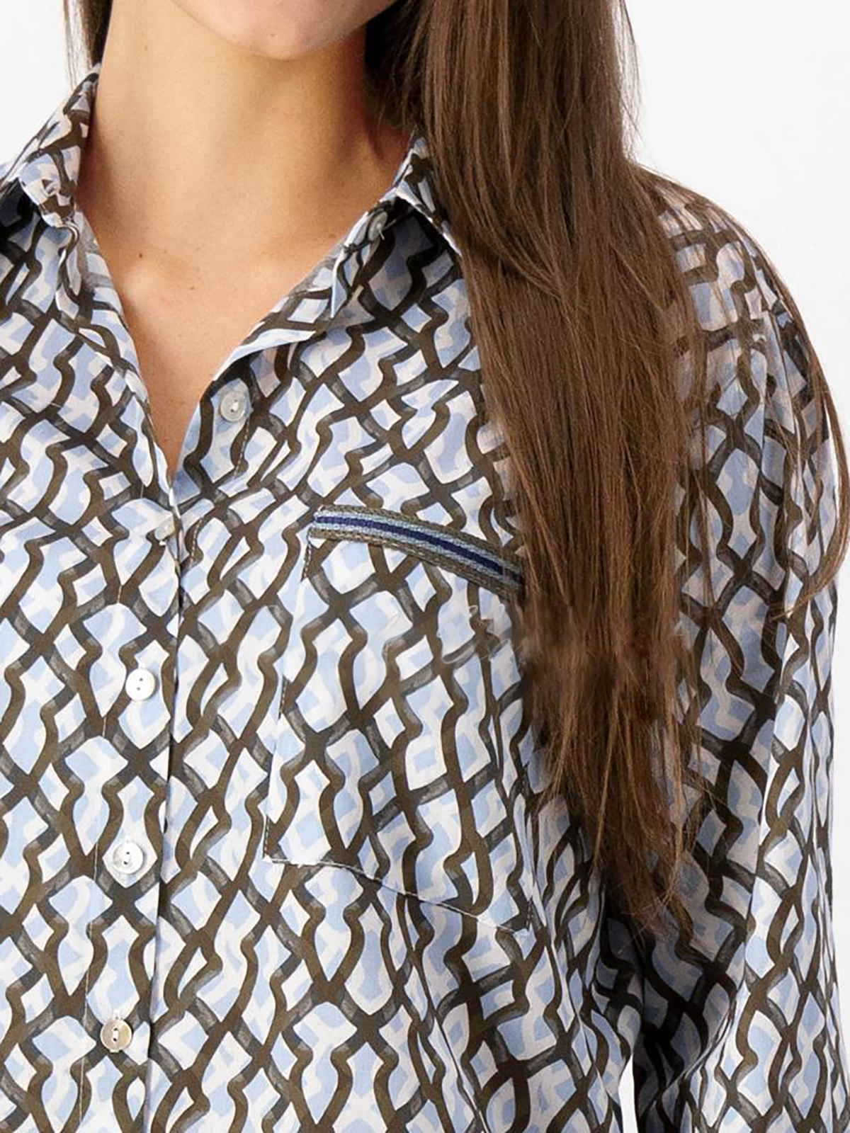 Блузка с оригинальным геометрическим узором по всей поверхности изделия. Прямой силуэт подходит для разных типов фигур, выгодно подчеркивая достоинства. Отложной рубашечный воротник, длинный втачной рукав с манжетами. Застежка на пуговицы в тон блузки. Накладной карман на груди.