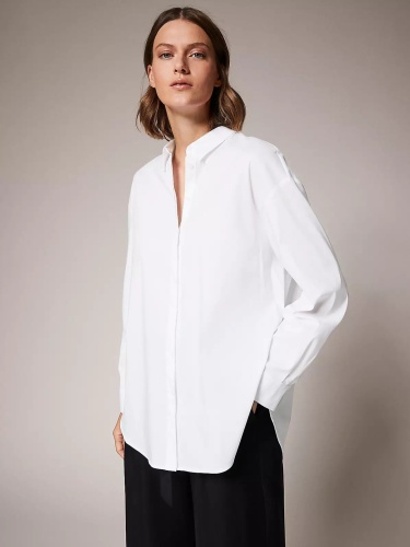 Белая классическая рубашка прямого кроя. Материал из смесового хлопка приятен к телу. Отложной рубашечный воротник, планка с пуговицами, длинный втачной рукав с широкой манжетой.