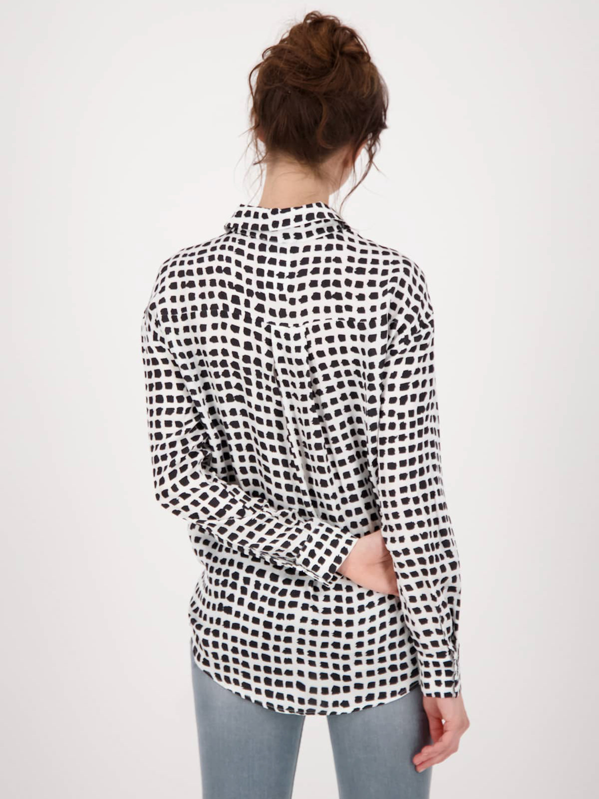Блуза в монохромном дизайне с абстрактным узором по всей поверхности изделия. Прямой крой, материал из 100% вискозы. Отложной рубашечный воротник, планка с пуговицами в тон. Длинные втачные рукава с манжетами.