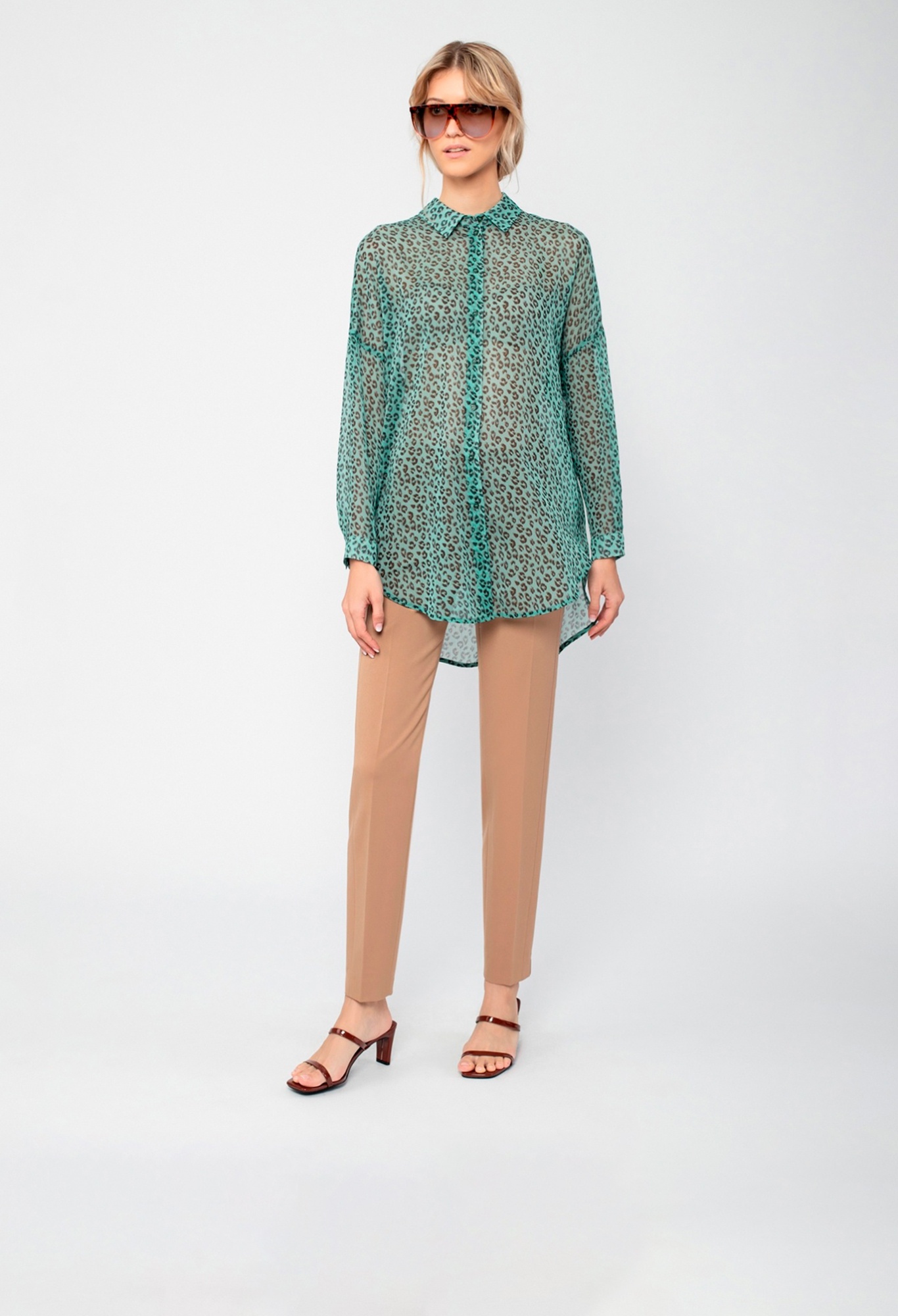 Блуза из плательной ткани в принте удлиненного прямого силуэта с классическим отложным воротником, втачным рукавом полной длины с манжетой и застежкой спереди на пуговицы. Низ изделия закругленный.