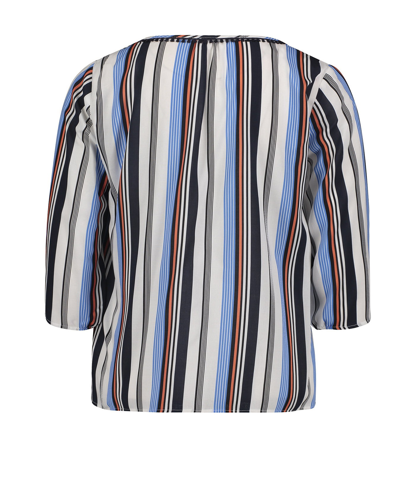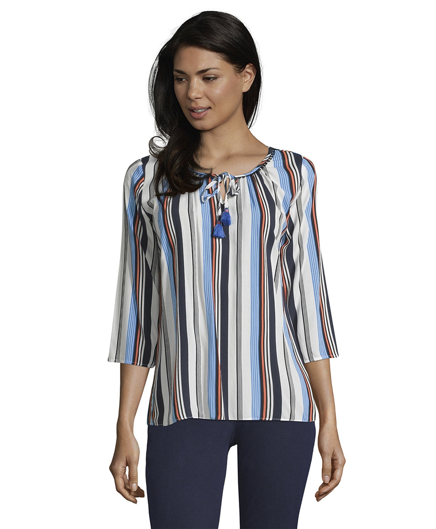 Полоска в тренде! Блуза прямого покроя. Женственный вырез горловины "замочная скважина", завязки с кисточками. Рукава 3/4. Вискозный материал приятен к телу и обеспечивает максимальный комфорт. Эта модная блуза - отличный компаньон для любого однотонного варианта низа, будь то брюки или юбка.
