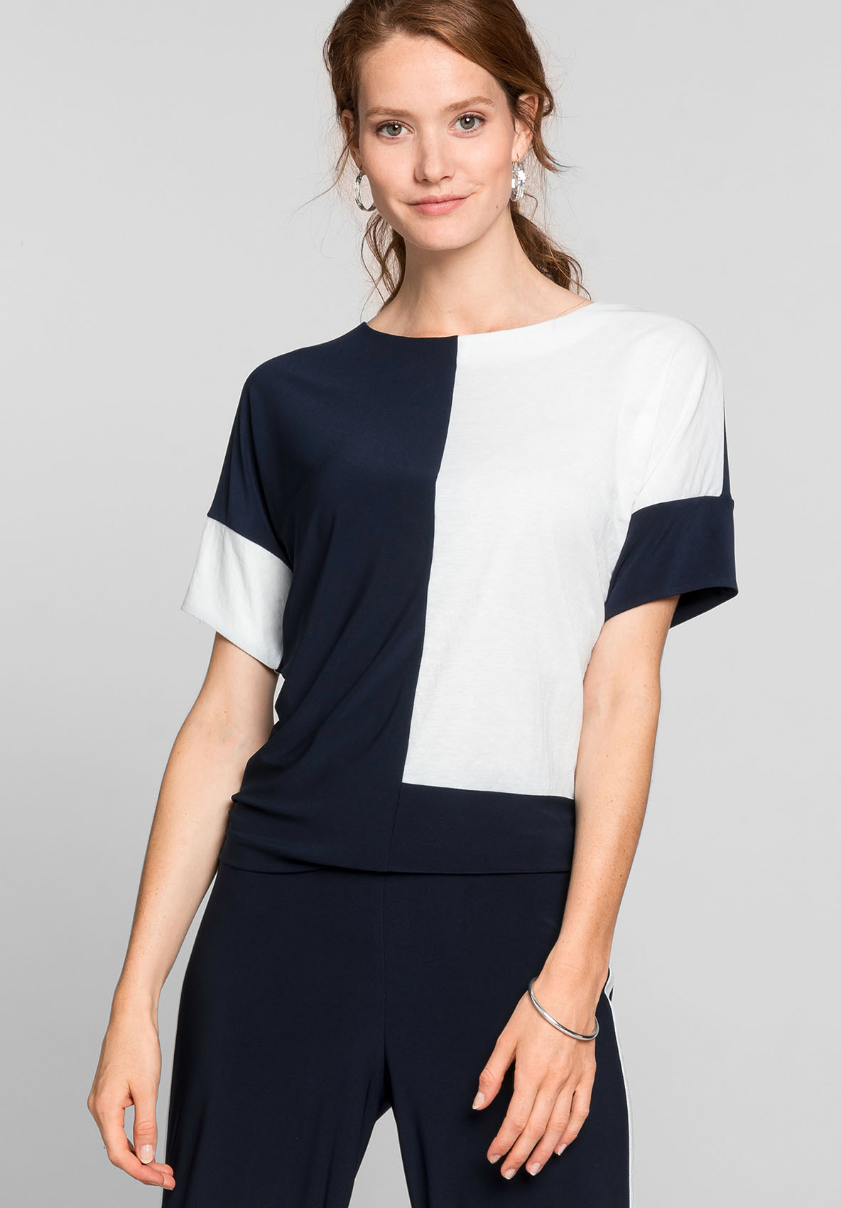 Стильная блуза Julie подходит для любого случая. Блуза обращает на себя внимание благодаря эффекту колор-блок. Длина бока регулируется кулиской. Спинка блузы выполнена из удобного однотонного трикотажа. Качественная эластичная ткань обеспечивает оптимальный комфорт. Короткий рукав с опущенным плечом, круглый вырез горловины и пуговичная планка на спинке стильно завершают образ. • в стиле колор-блок • высококачественная эластичная ткань • кулиски с лентой BIANCA по бокам изделия • круглый вырез, рукав со спущенным плечом, пуговичная планка на спинке • длина около 64 см