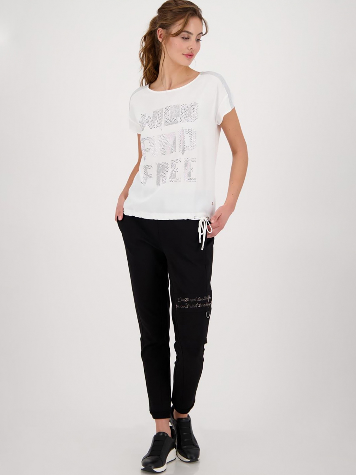 Однотонная белая блузка с принтом , украшенным стразами. Овальный вырез горловины, короткий втачной рукав. Декоративная блестящая лента по плечам блузы.