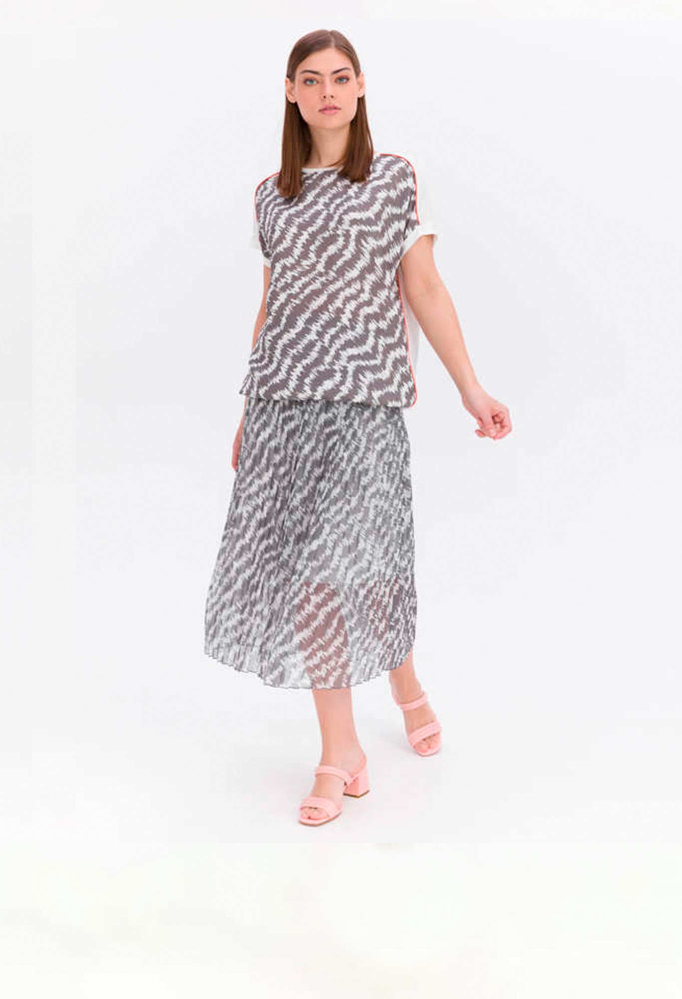 Блузка с анималистическим принтом на полочке и яркой полоской на спинке. Выполнена из эластичного материала на основе вискозы. Прямой крой. Короткий цельнокроеный рукав .