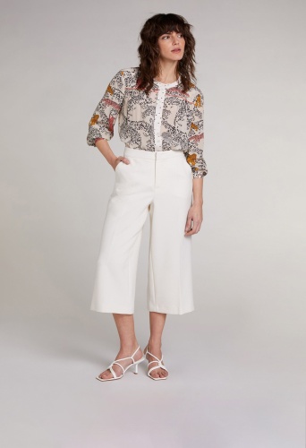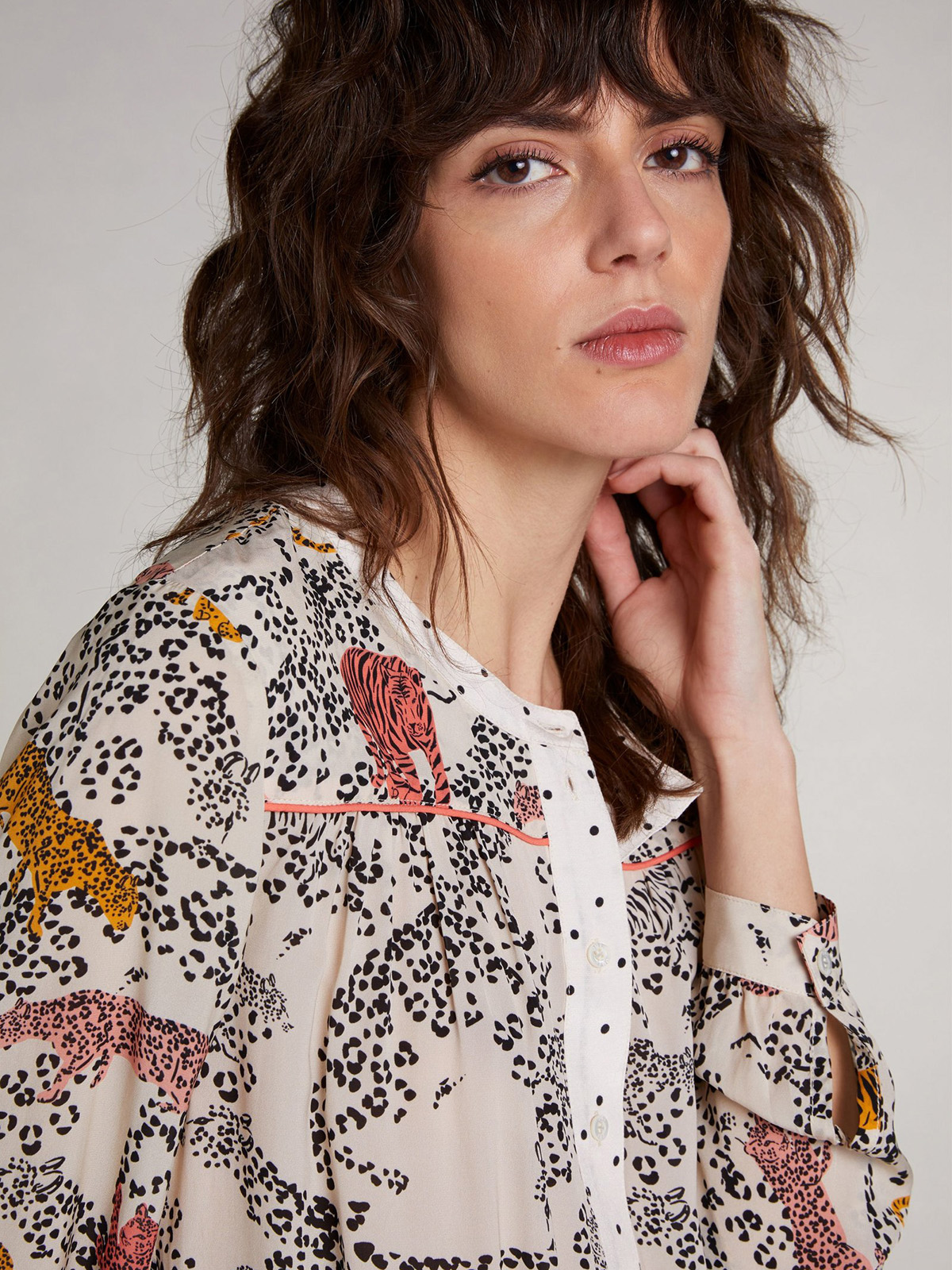 Блуза с анималистичным узором по всей поверхности материала. Планка с пуговицами и воротник с точечным рисунком. Втачной рукав полной длины с манжетой на одну пуговицу. Скругленный низ изделия.