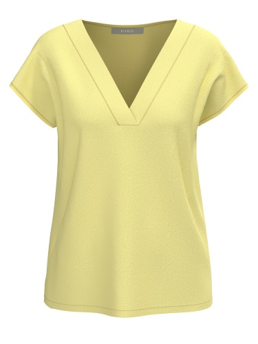 Однотонная блуза насыщенного желтого оттенка привнесет в образ летнее настроение. V-образный вырез горловины подчеркивает линию шеи. Короткий цельнокроеный рукав облегчает силуэт. Ткань из смесовой вискозы гарантирует долговечность изделия.
