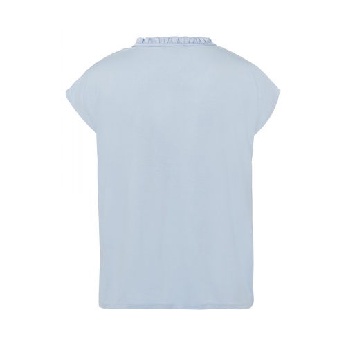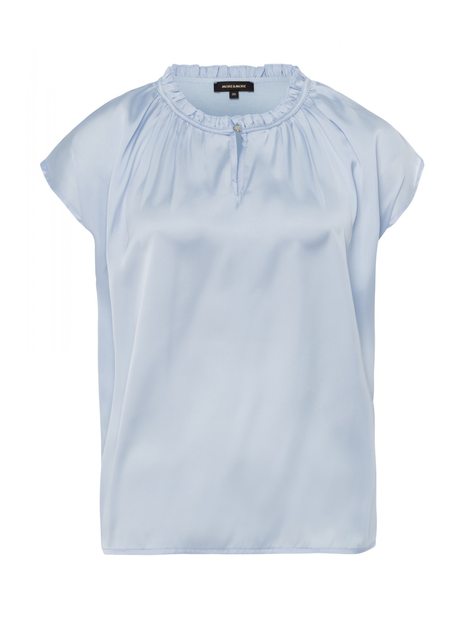 Женственная блузка-рубашка с блестящей атласной передней частью и мягкой трикотажной спинкой. -прямой крой -короткий рукав -небольшая оборка на круглом вырезе горловины -вырез и пуговица спереди -длина по размеру 42 = 62 см