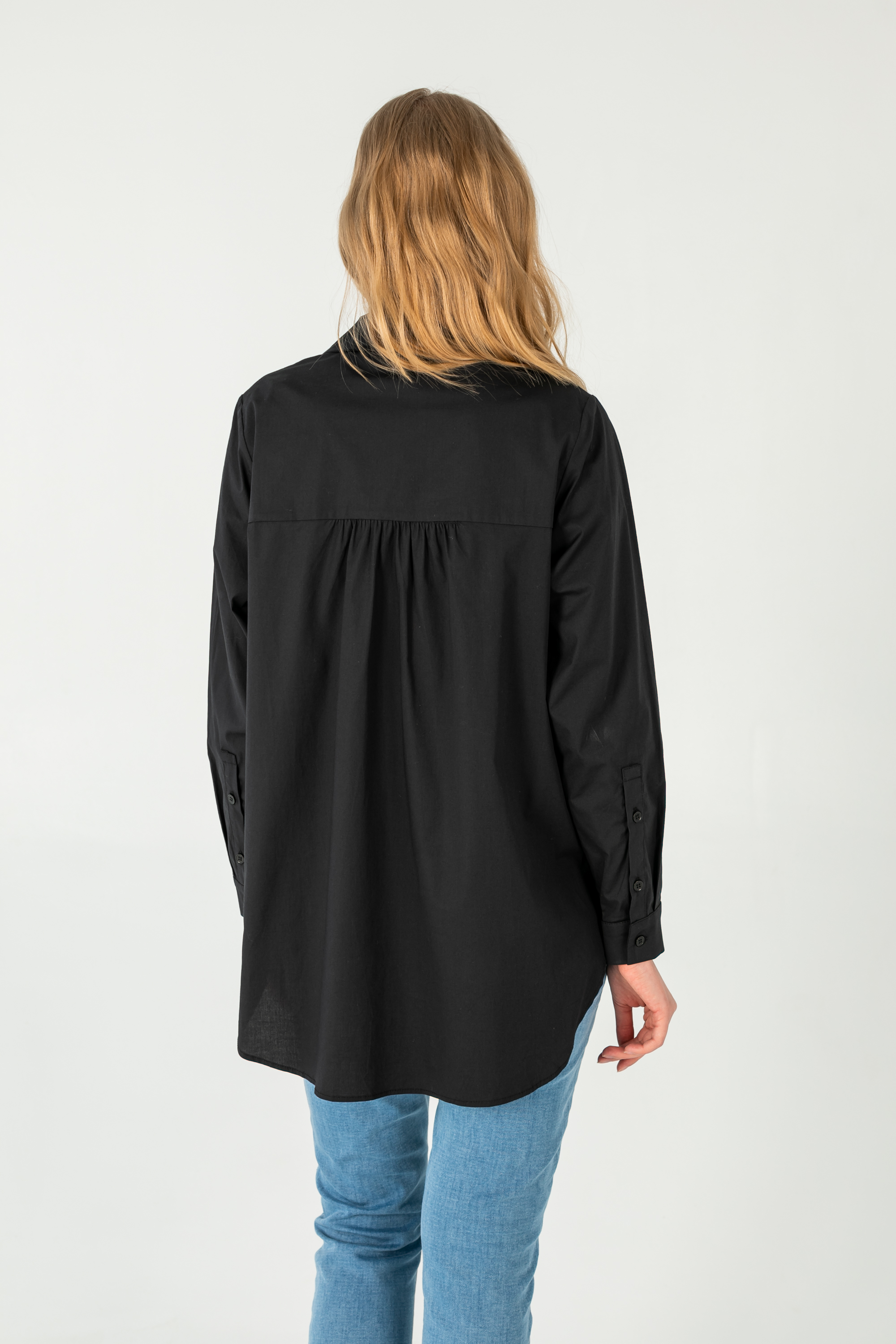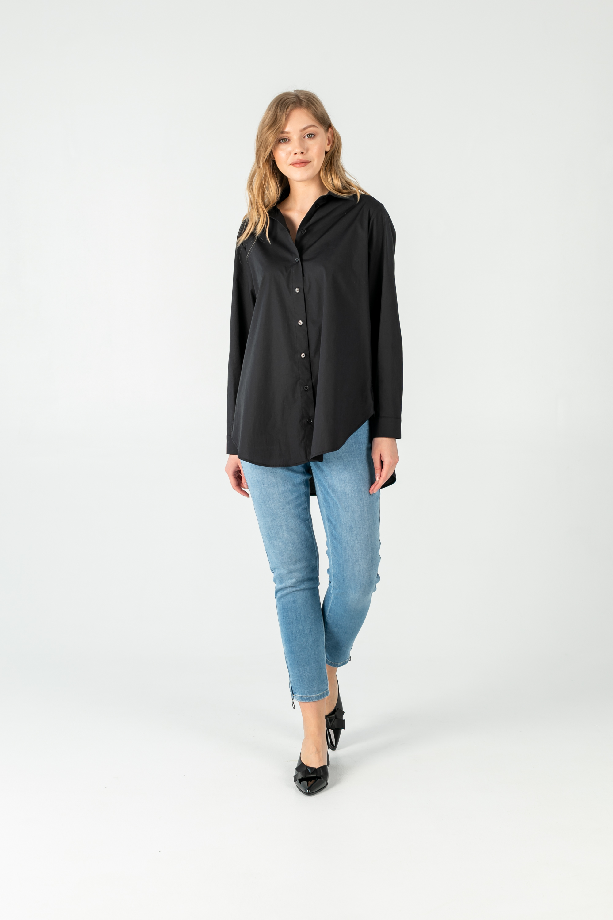 Классическая рубашка в 2-х цветах в стиле оверсайз с удлинением и декоративным элементом на спине.