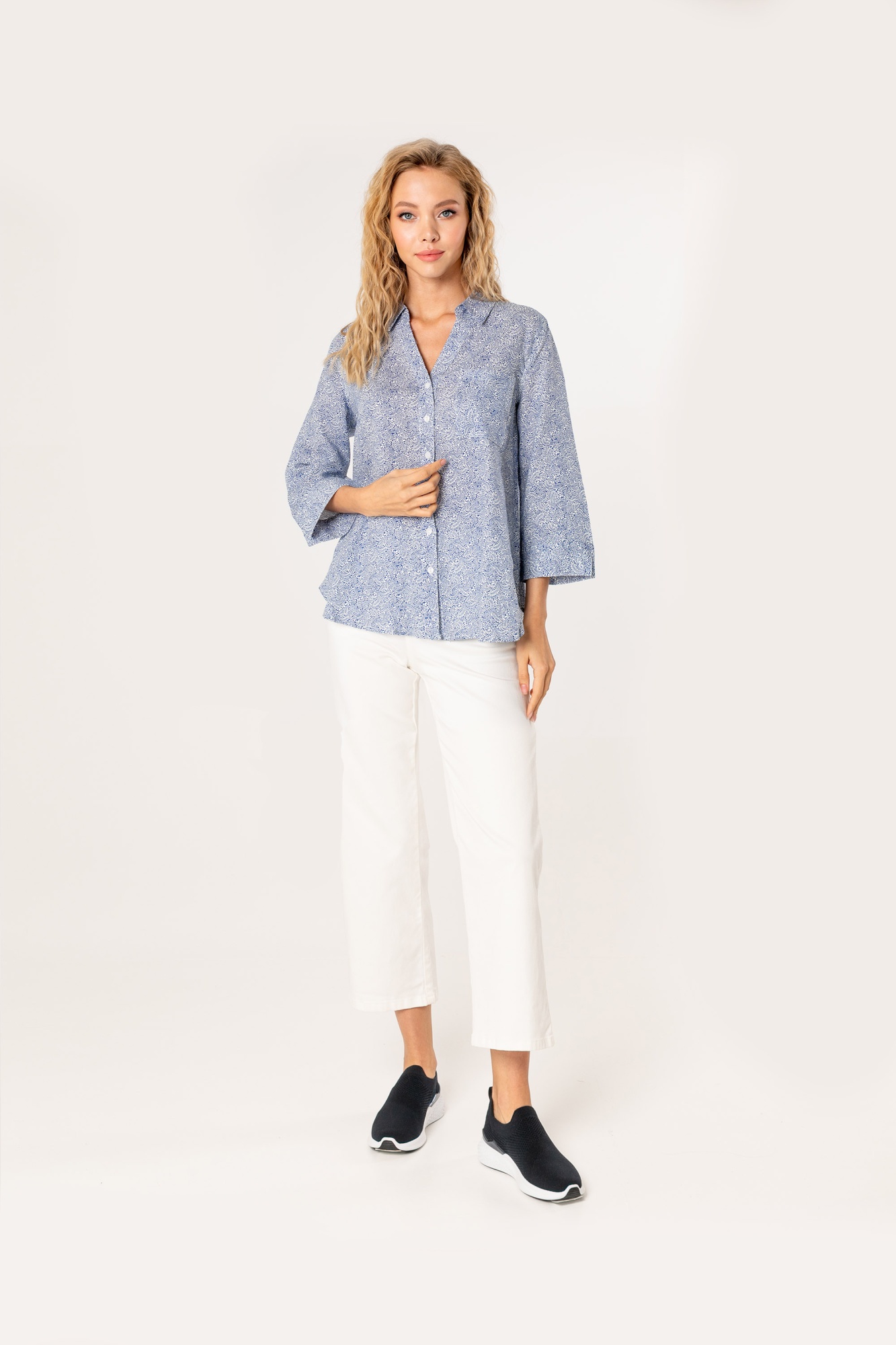На сайте указаны российские размеры. Ткань: стильная блузка из смеси хлопка и льна – выбор тех, кто привык выбирать максимальный комфорт. Крой: свободный силуэт с отрезными расклешенными рукавами дарит свободу движения.. V-образный вырез и небольшой рубашечный воротничок подчеркивают красоту шеи, не фокусируя внимание на зоне декольте. Удлиненная блузка с идеальной посадкой позволяют показать достоинства и мастерски скрыть возможные недостатки фигуры. Отделка: стильный бело-синий принт приковывает взгляды. Широкие манжеты с разрезами можно подвернуть, добившись нужной длины рукава. Фигурный низ блузки с плавными линиями создает женственный силуэт. Сочетайте блузку с однотонным ассортиментом из коллекции Stern – брюками, юбками, трикотажем и денимом.