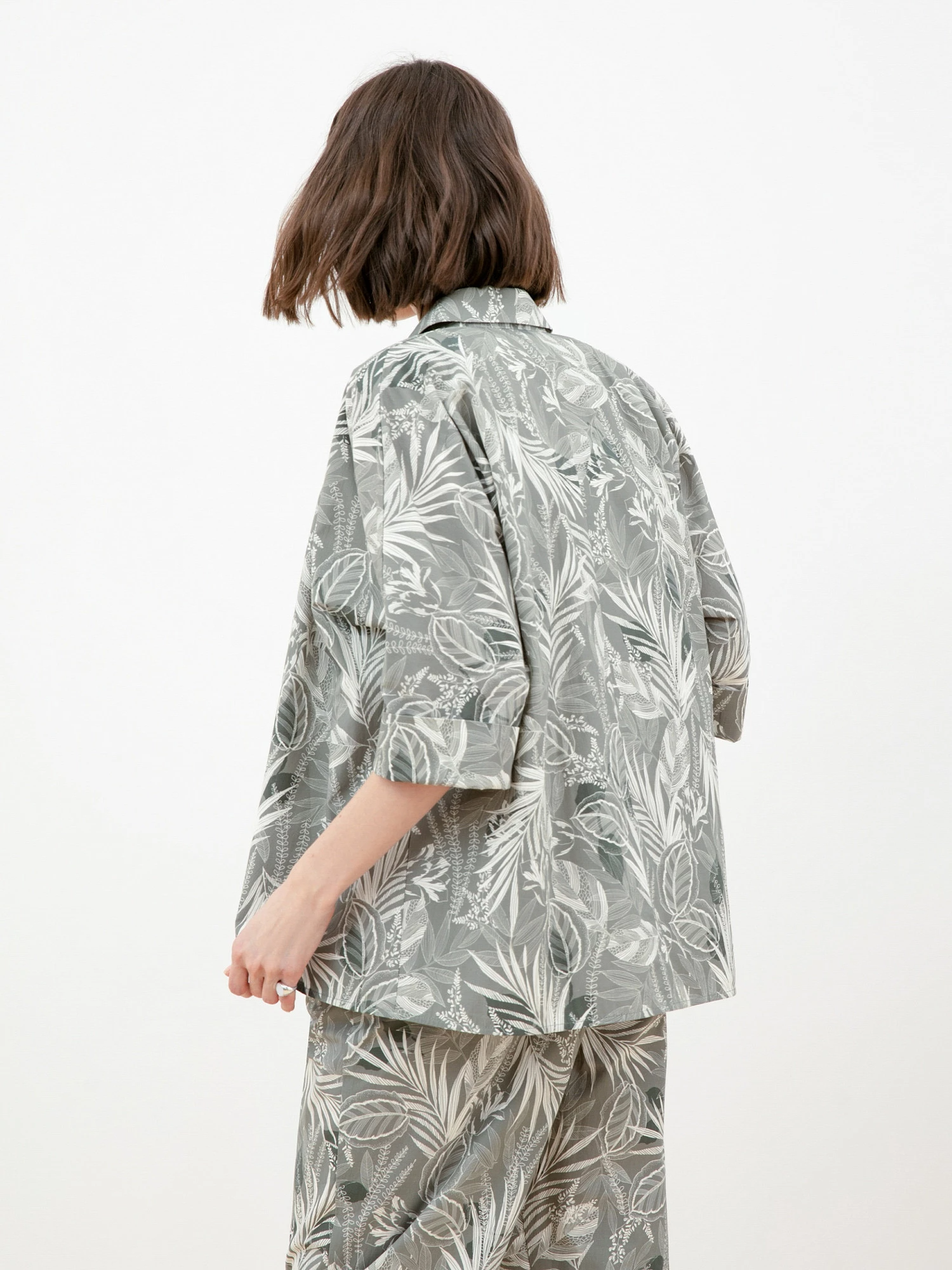 Блуза прямого ситуэта из хлопковой ткани в растительный принт. Воротник отложной, рукав-кимоно, низ рукава обработан притачной манжетой. Застежка потайная на пуговицы.