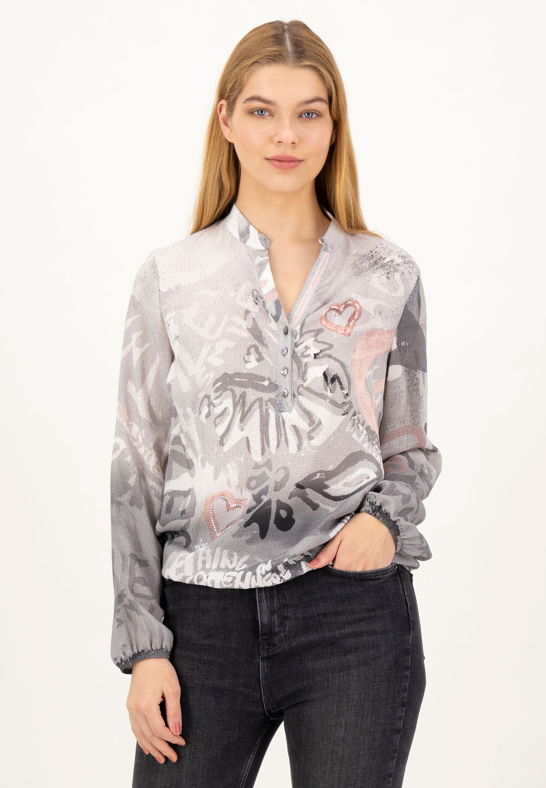 На сайте указаны российские размеры. Модная блуза с длинными рукавами и блестящими аппликациями из 100% вискозы. Эластичные ленты на кромке и манжетах рукавов также обещают высокий уровень комфорта. Наша модель ростом 177 см. Измерения для 44 размера: Окружность груди: 104 см Талия: 102 см Обхват бедер: 112 см. Длина по спинке: 62 см. Длина рукава: 62 см.