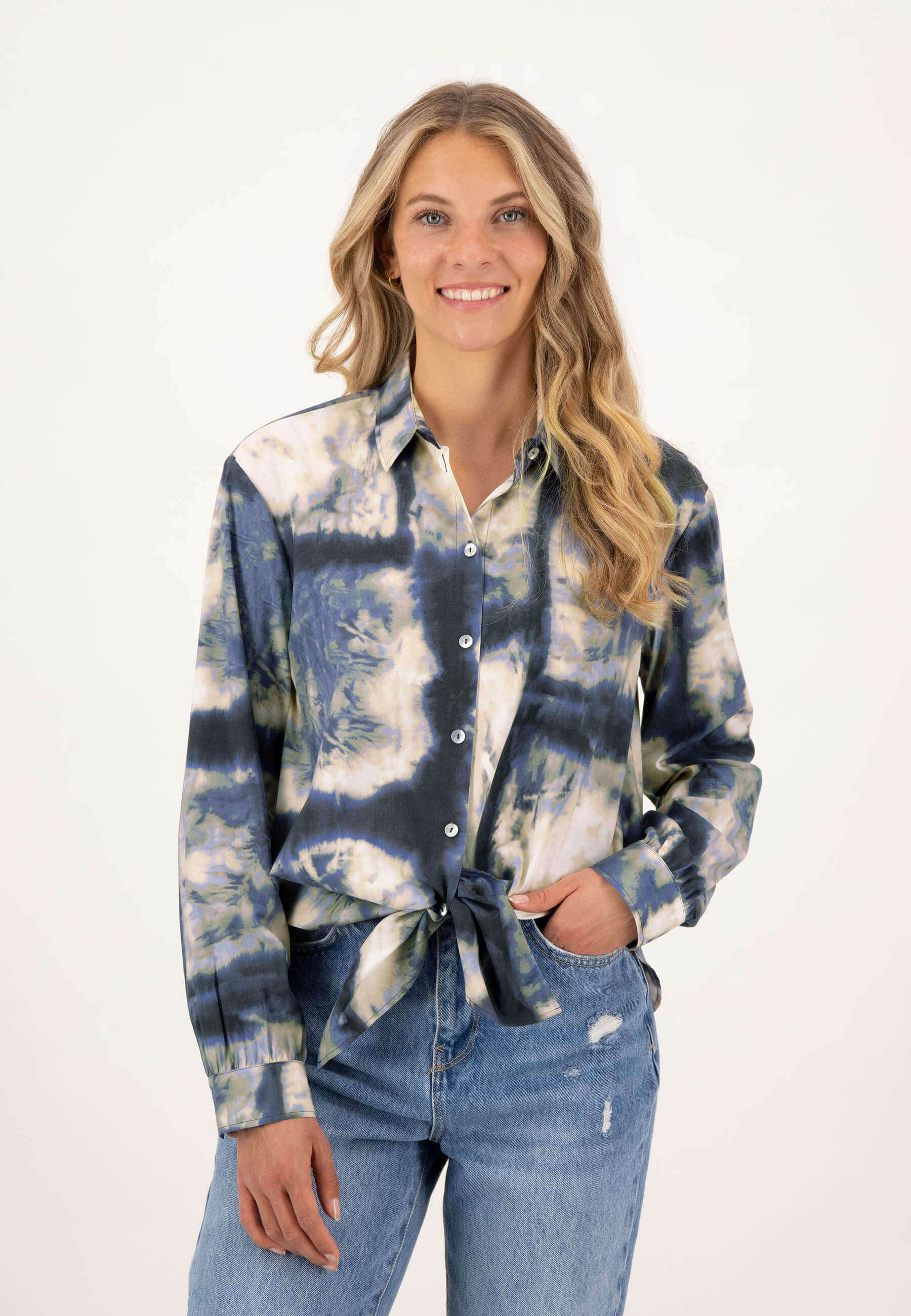 На сайте указаны российские размеры. Экологичная блуза-рубашка синего цвета с принтом тай-дай по всей поверхности. Сделано из экологически чистых материалов и "Сделано в Европе" - это только два аргумента в пользу этой блузки. Он впечатляет не только своим привлекательным принтом по всей поверхности, но и интересными деталями, такими как гофрированный низ рукава, двухъярусный закругленный низ или блестящие перламутровые пуговицы. Наша модель ростом 177 см. Измерения для 44 размера: Окружность груди: 112 см Талия: 110 см Бедра: 119 см Длина спинки: 78 см. Длина рукава: 60 см.