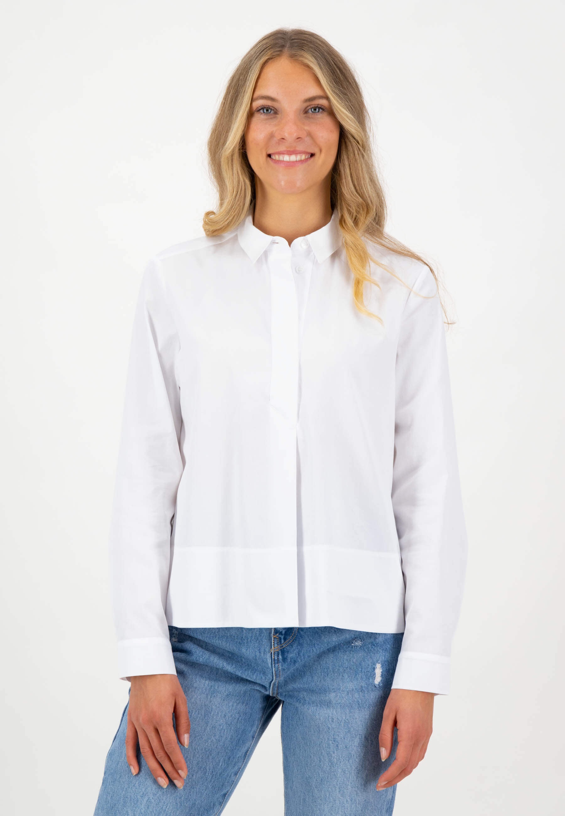 На сайте указаны российские размеры. Белая блузка с длинными рукавами и планкой на потайных пуговицах. Эта блузка имеет спортивный вид, современный и современный благодаря планке с потайными пуговицами, воротнику рубашки и разделительному шву, но и ее качество: экологически чистые материалы, произведенные в Европе. Повседневную блузу можно комбинировать несложно и универсально, поэтому она идеальна для повседневного образа. Рост модели 177 см Измерения для 46 размера: Окружность груди: 104 см Бедра: 125 см Длина спинки: 60 см. Длина рукава: 61 см.