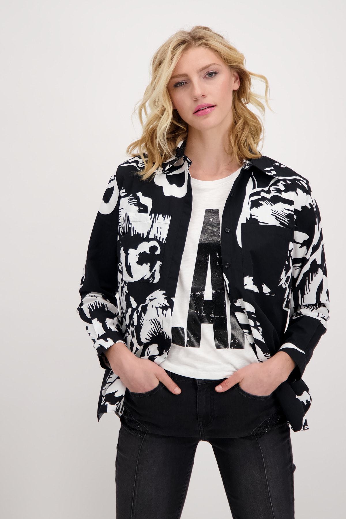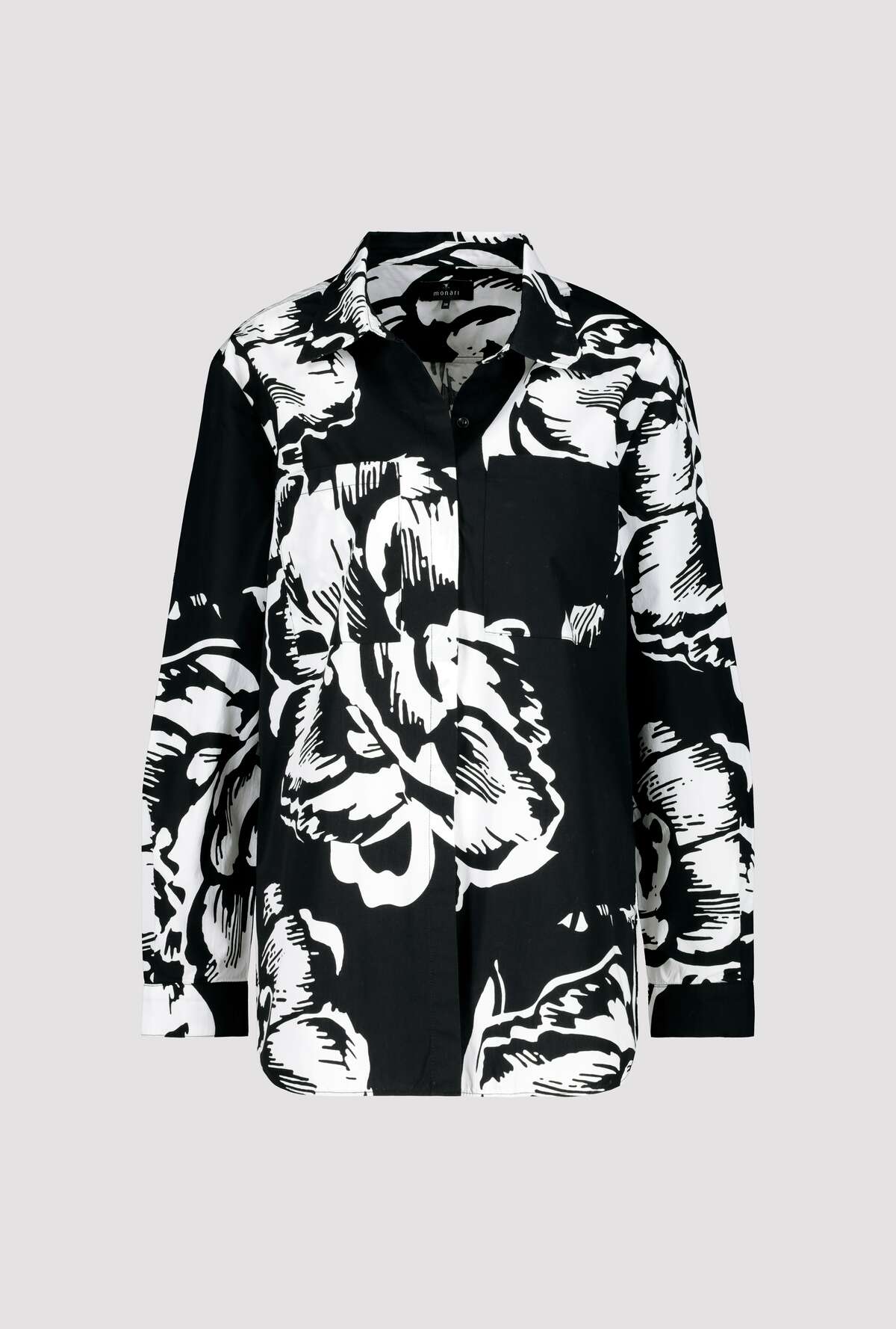 На сайте указаны российские размеры. С модной блузкой-рубашкой от monari у вас будет отличный наряд на любой случай. В классическом крое с отложным воротником, длинными рукавами с манжетами на пуговицах, планкой на потайных пуговицах и двумя накладными карманами на груди вас вдохновит модель с закругленным низом. Стильные цветочные узоры снова в моде в этом сезоне и придают каждому образу что-то свое. Совет по стилю: наденьте расстегнутую поверх современной футболки с лакированными надписями и темных джинсов. Модель ростом 179 см. Длина спины 44 размера 73 см.