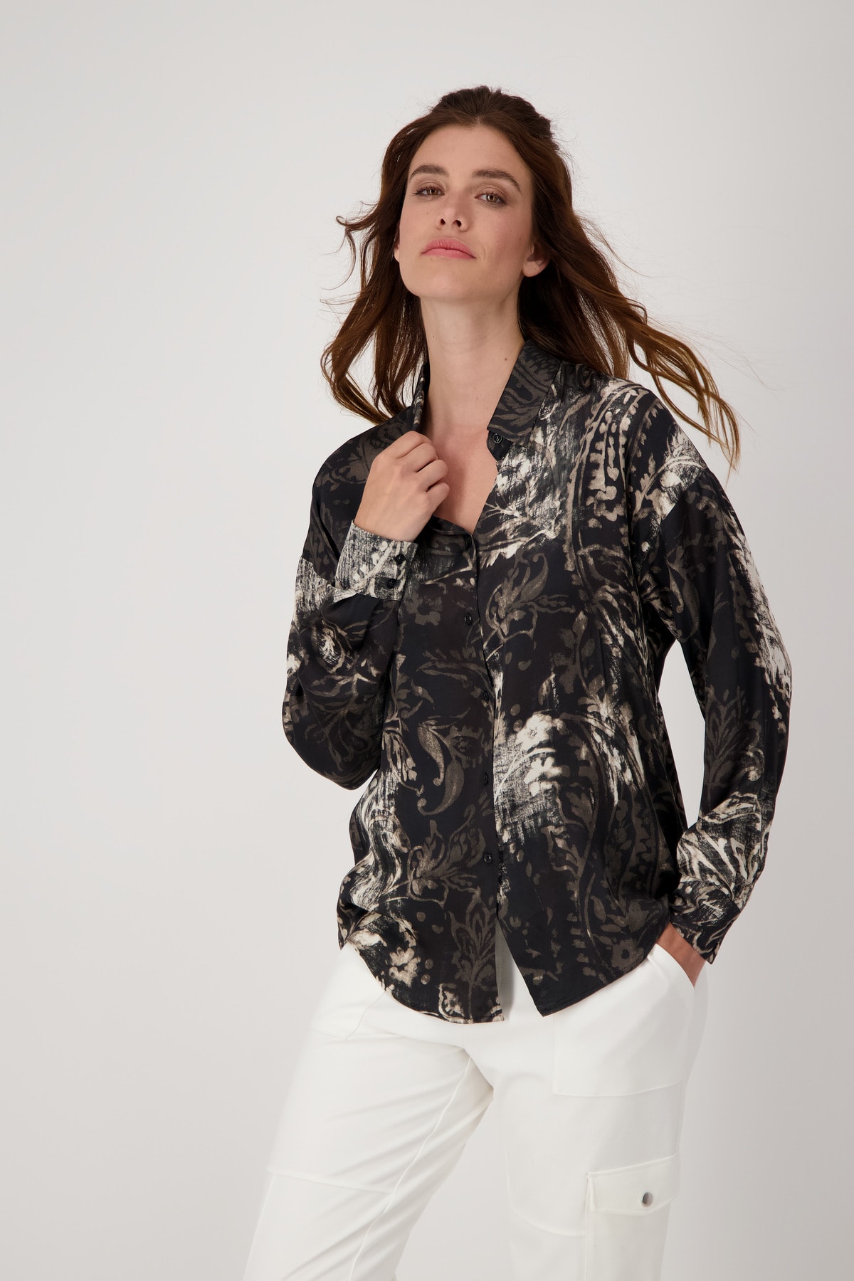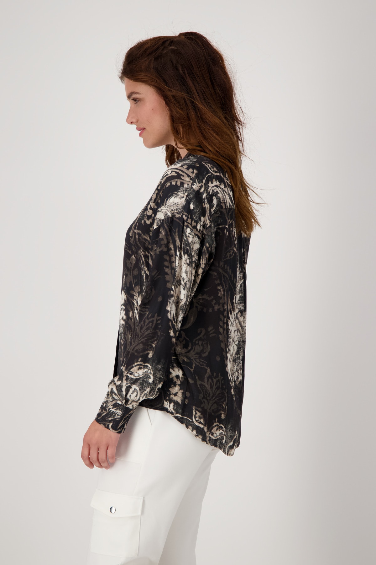 На сайте указаны российские размеры. Блузка с воротником-стойкой и принтом пейсли по всей поверхности. Рубашка-фасон с классическим рубашечным воротником, блуза-рубашка прямого кроя с удлиненной спиной и закругленным низом. Планка с пуговицами, манжеты на двух пуговицах на концах рукавов и кокетка со стильной коробчатой складкой на спине завершают дизайн изящно струящейся модели. Не отказывайтесь от эксклюзивной модели из вискозы с принтом пейсли по всей поверхности. Отлично подойдут к светлым брюкам в стиле карго с модными кроссовками. Рост модели 175 см. Длина по спинке 44 размера составляет 74 см, а по переду – 70 см.