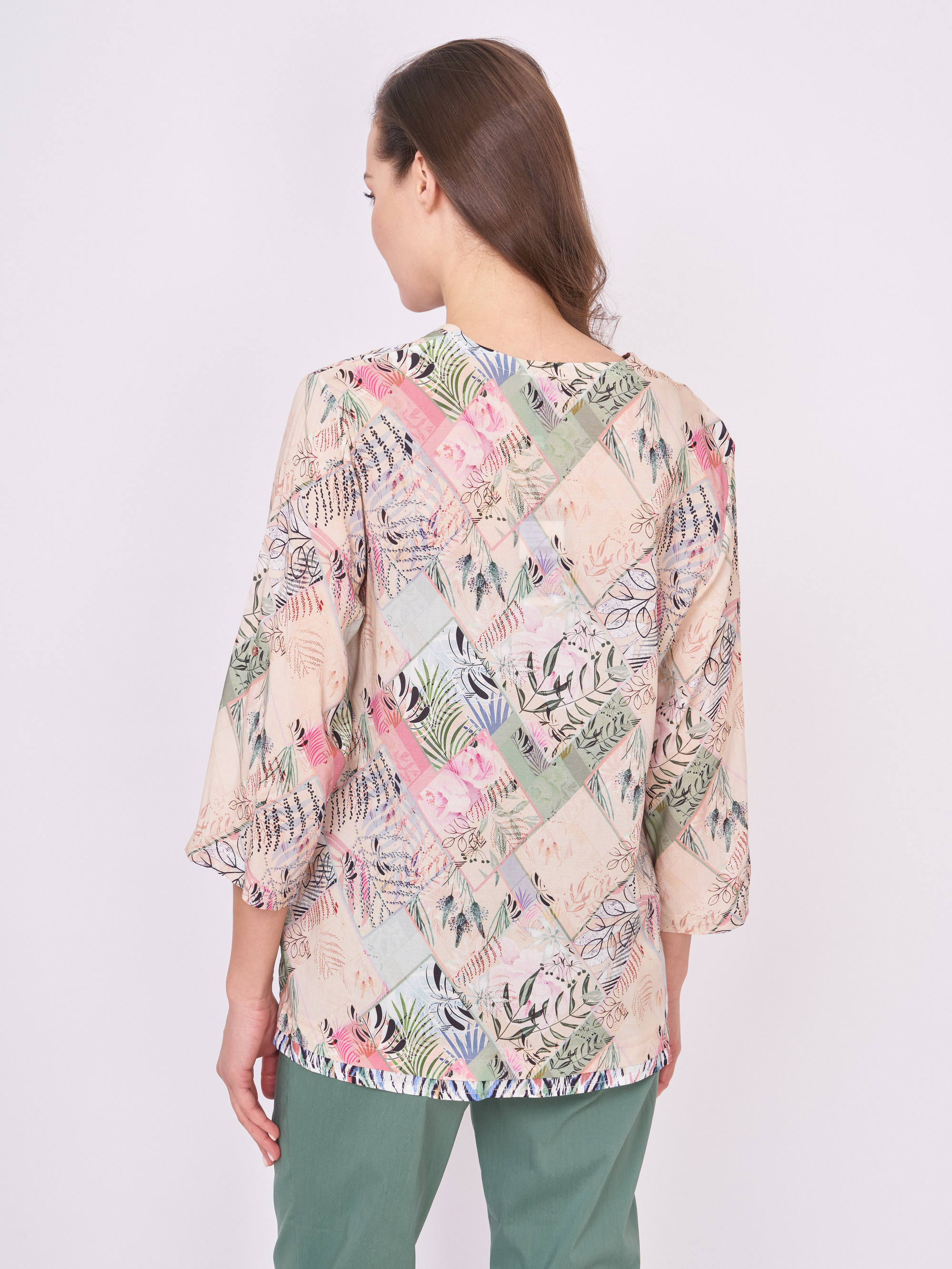 На сайте указаны российские размеры. Прямая текстильная персиково-розово-зеленая блузка на пуговицах, с V-образным вырезом, с укороченным рукавом 3/4, с цветочным рисунком. Длина по спинке: 66 см. Рост модели: 177 см.