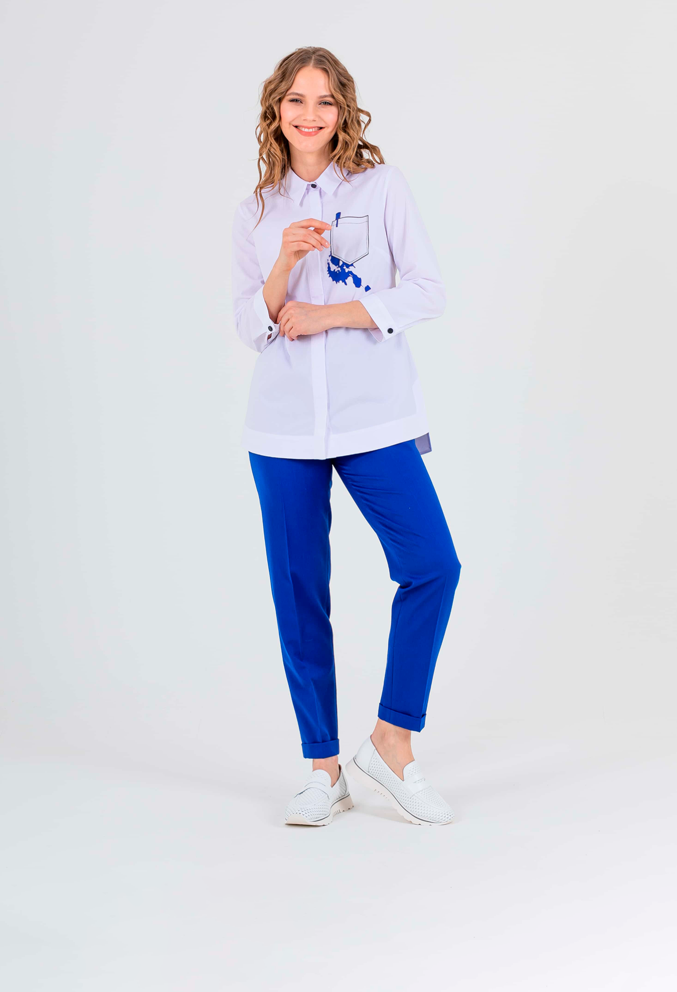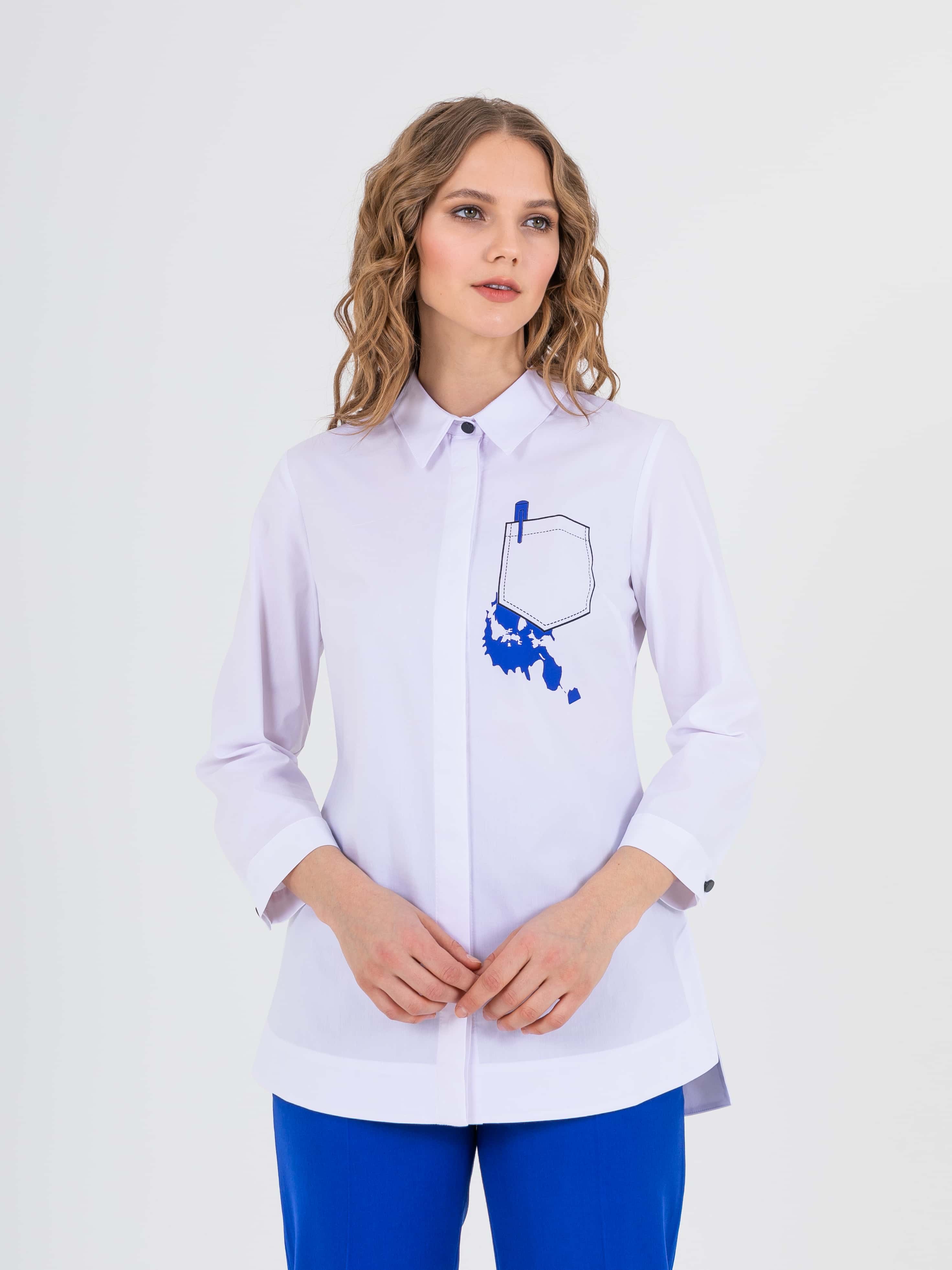 На сайте указаны российские размеры. Блуза полуприлегающего силуэта длиной до линии бедер с ассиметричной линией низа и разрезами в боковых швах. Перед с двумя вытачками на выпуклость груди, идущими из боковых швов, также на левой половине переда в области груди выполнен яркий, интересный принт. Застежка потайная на 10 пуговиц. Втачные рукава ¾ с манжетами, прорезными петлями и пуговицами. Стояче-отложной воротник.