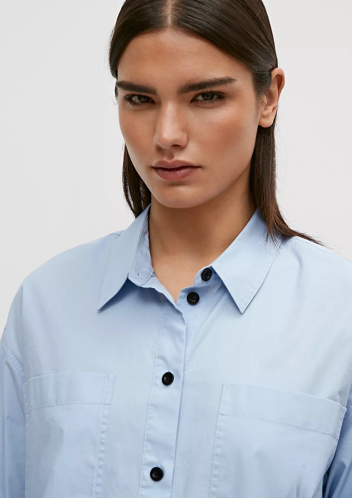 На сайте указаны российские размеры. Блуза свободного кроя с разрезом сбоку и закругленным низом. Заниженная линия плеча, длинные рукава, манжеты. Длина спины 81 см в размере 42 Рост модели 177 см.