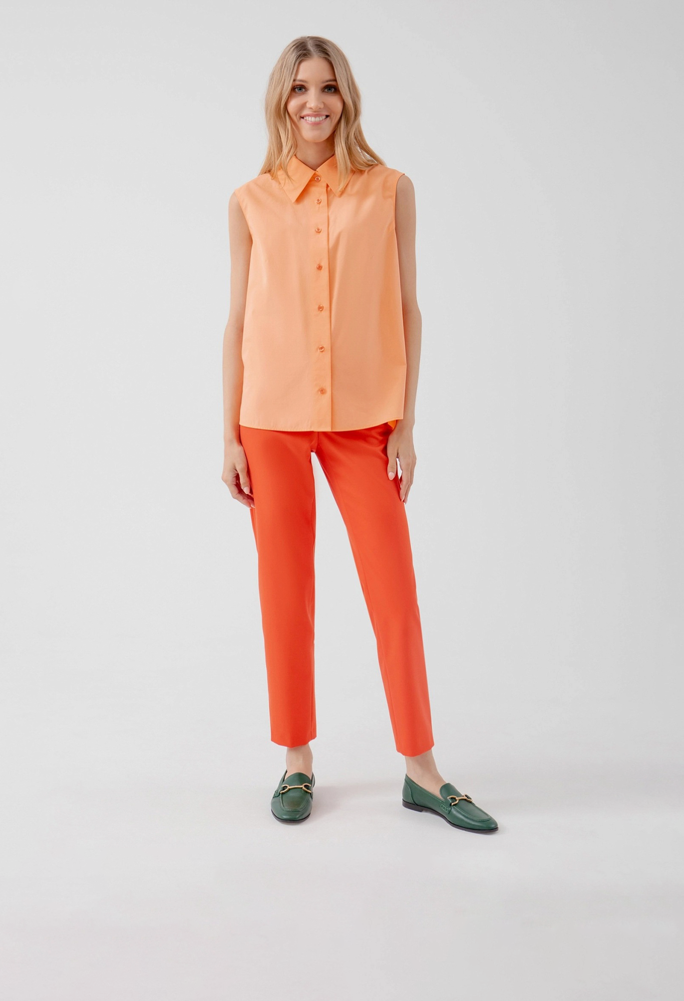 На сайте указаны российские размеры. Блуза прямого силуэта без рукавов и разрезами по бокам, имеет классический отложной воротник. Выполненная из 100% хлопка в персиковым цвете. Рост модели 175 см.