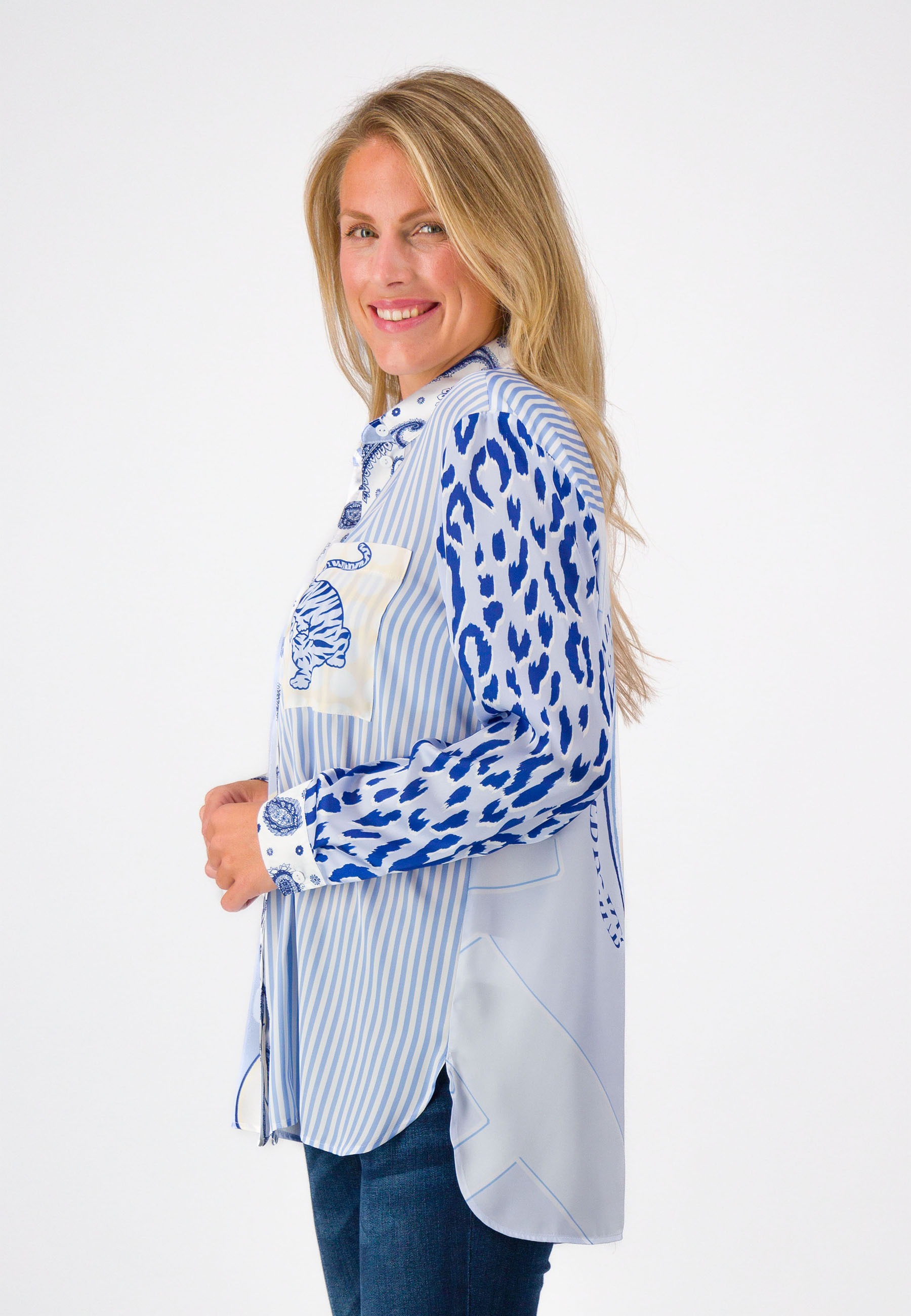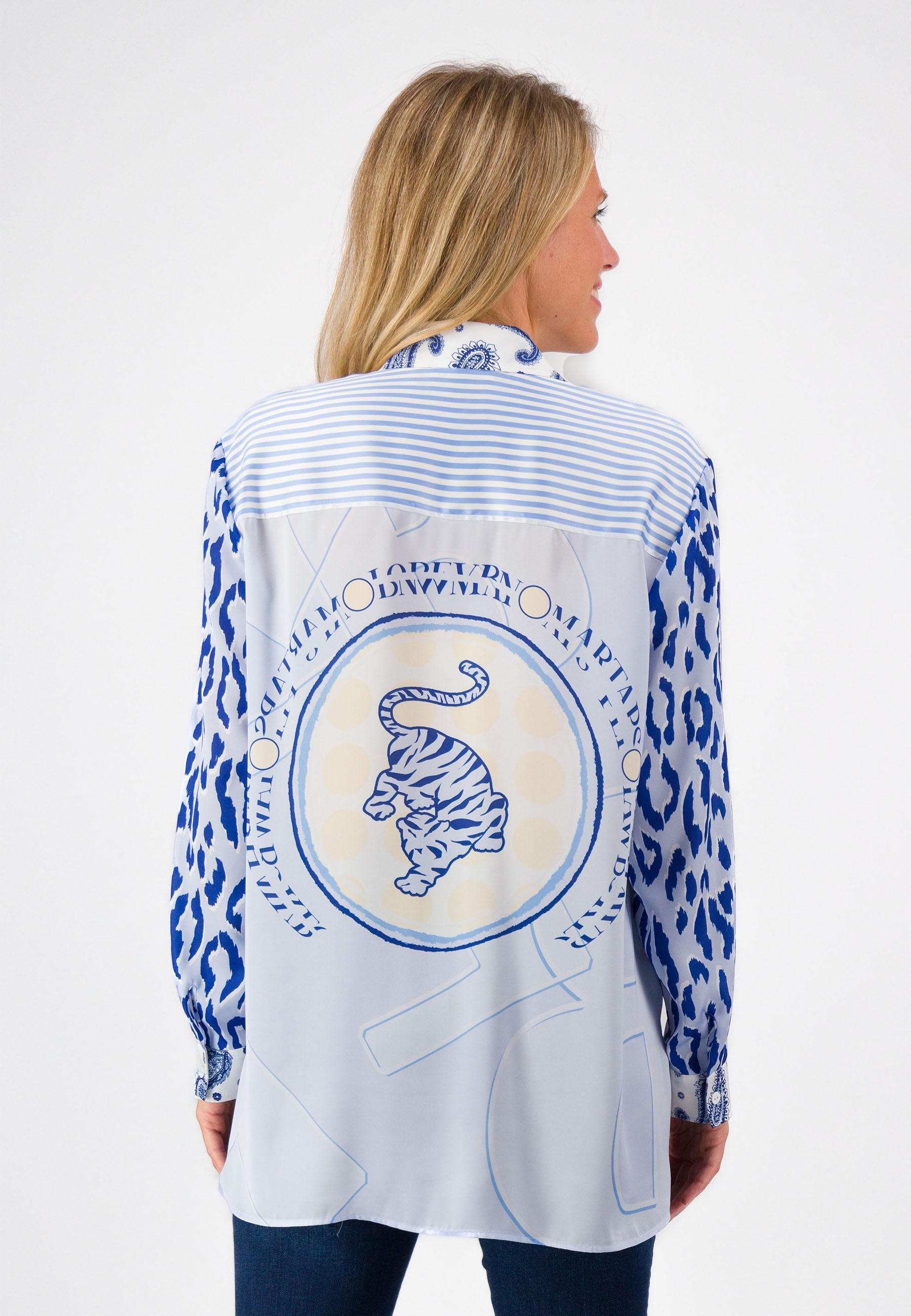 Изюминка текущего сезона: эта красивая блуза с рубашечным воротником притягивает взгляды и превращает каждый образ в нечто особенное! Блузка с длинными рукавами впечатляет захватывающим сплошным принтом. Здесь множество различных дизайнов идеально гармонируют друг с другом. Слегка удлиненная задняя часть в сочетании с высококачественным материалом из 100% вискозы обеспечивает легкость блузки. Обращает на себя внимание детальный принт на спине, который можно найти и на нагрудном кармане.