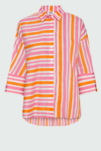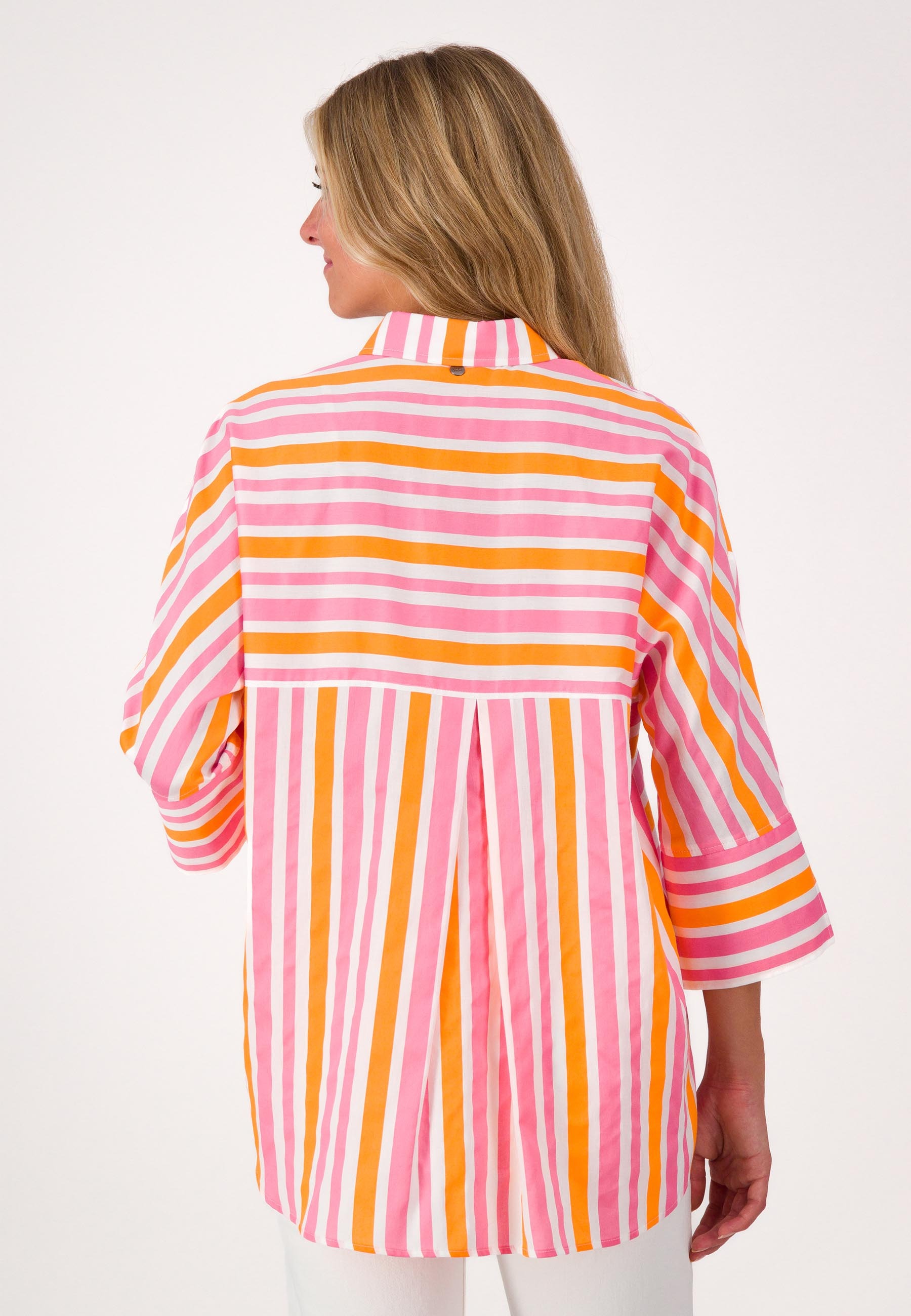 Полосатая хлопковая блуза с рубашечным воротником и рукавами ¾ станет прекрасным дополнением к вашему гардеробу. Он имеет вертикальные и горизонтальные полосы, которые придают ему уникальный и вневременной вид. Поскольку полосы расположены разной ширины, они создают интересный и динамичный образ. Мягкая и легкая ткань обеспечивает приятный комфорт для кожи и поэтому идеально подходит для теплых месяцев.