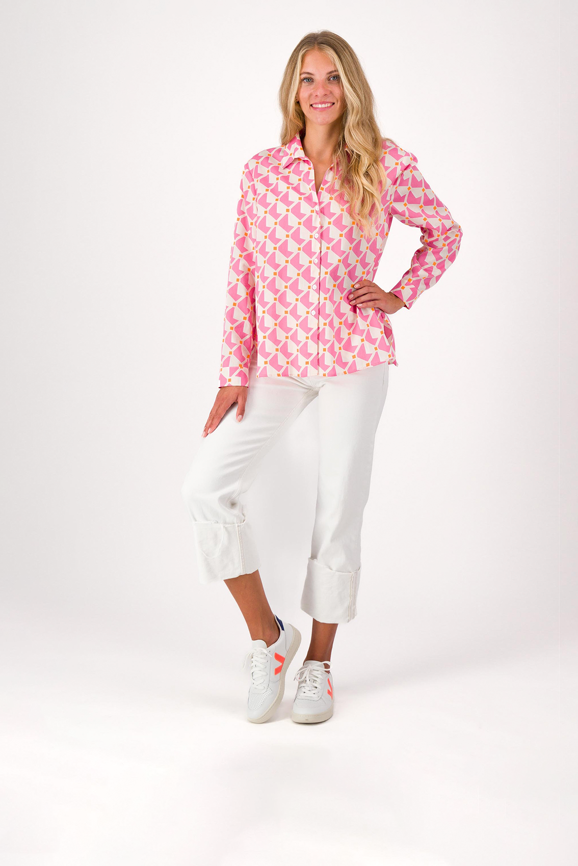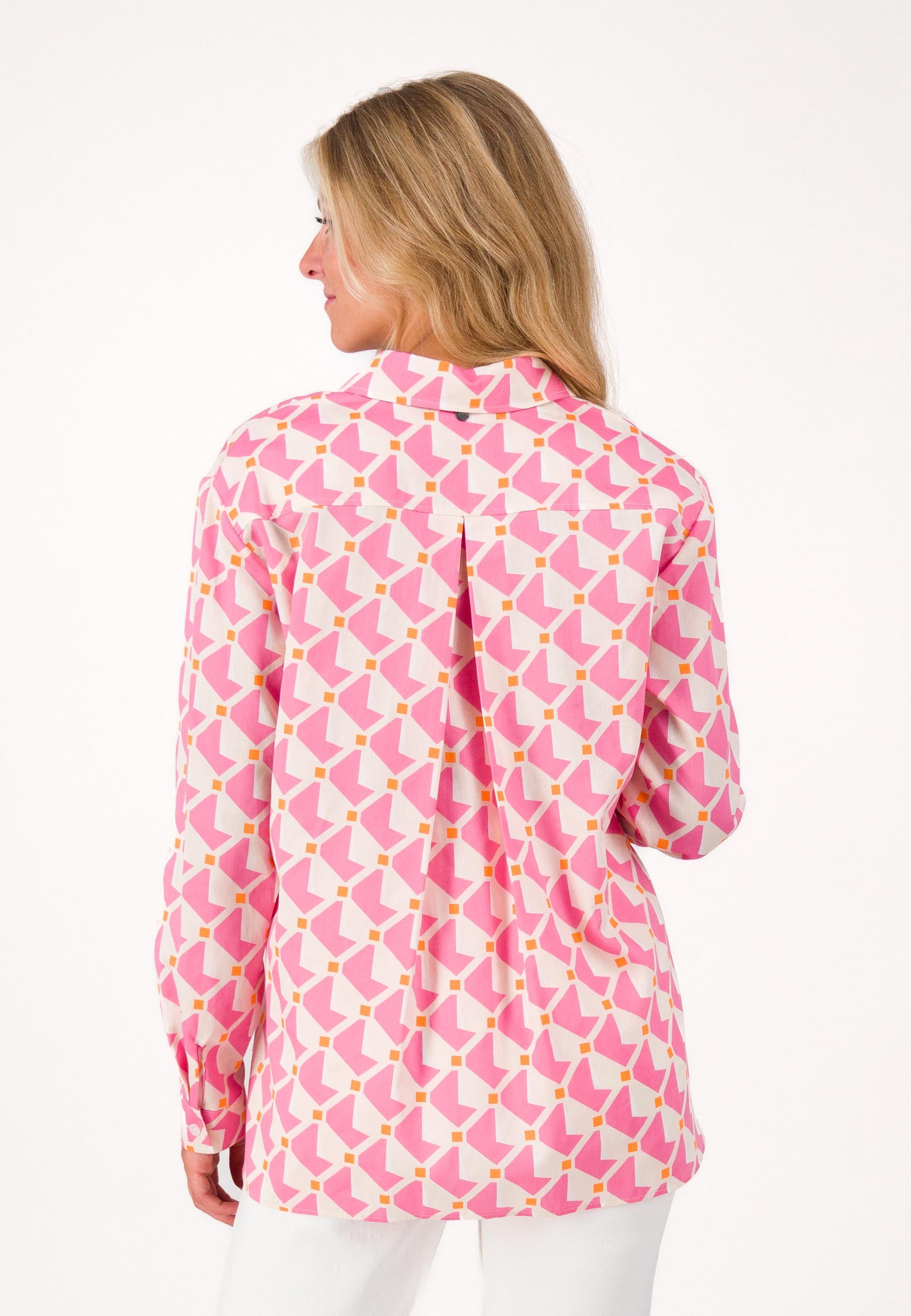 Отличным выбором для летних месяцев станет свободная блуза с отложным воротником и геометрическим узором. Изготовлен из 100% хлопка, удобен в носке и приятен на ощупь. Свободный крой также обеспечивает большую свободу движений и является идеальным выбором, особенно в теплое время года. Сочетайте блузку с блейзером для офисного образа или небрежно с джинсами, в ней вы всегда будете чувствовать себя комфортно.