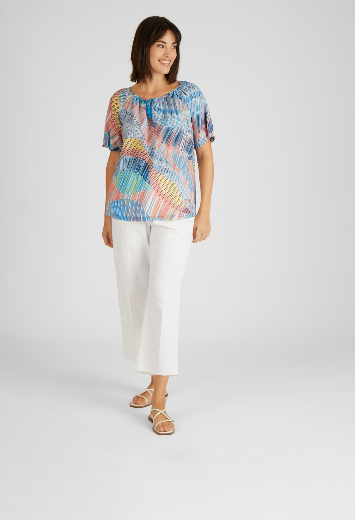 Блузка с короткими рукавами и абстрактным узоро. Небольшой V-образный вырез можно уменьшить до небольшого модного разреза с помощью ленточек на воротнике. Широкая форма придает непринужденный вид, а струящаяся ткань приятна на ощупь. Носите блузку небрежно с джинсами или брюками.
