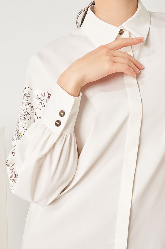 Блузка-рубашка свободного силуэта. отложной воротник-стойка, центральная потайная застежка на перламутровые пуговицы. Спущенная линия плеча, рукава декорированы дизайнерским принтом с бусинами и пайетками. Рукава сосборены на манжеты с разрезом и застежкой на пуговицы. В шов манжеты заложены складки. Спинка и перед с плавным закруглением по низу.