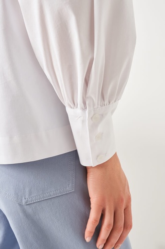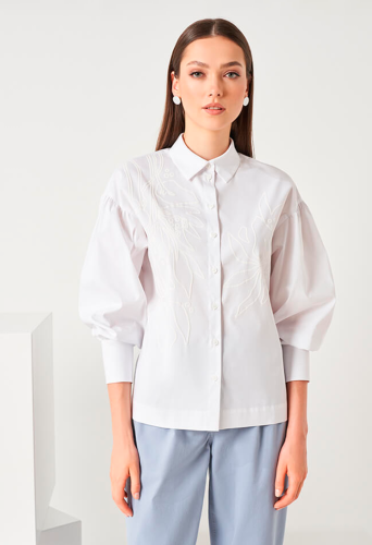 Блузка-рубашка свободного силуэта, отложной воротник-стойка, центральная застежка на пуговицы. Спущенная линия плеча, объемные рукава сосборены на высокие манжеты с разрезом и застежкой на пуговицы. В шов манжеты заложены складки, в боковых швах выполнены разрезы. Спинка с кокеткой. Спереди выполнен дизайнерский принт в тон «Флора».