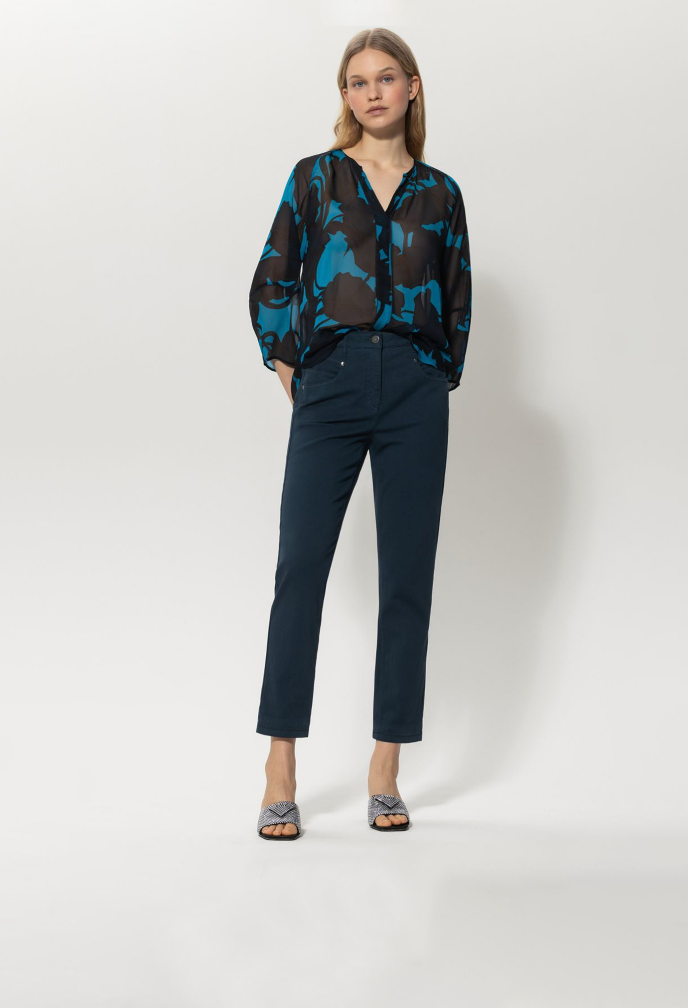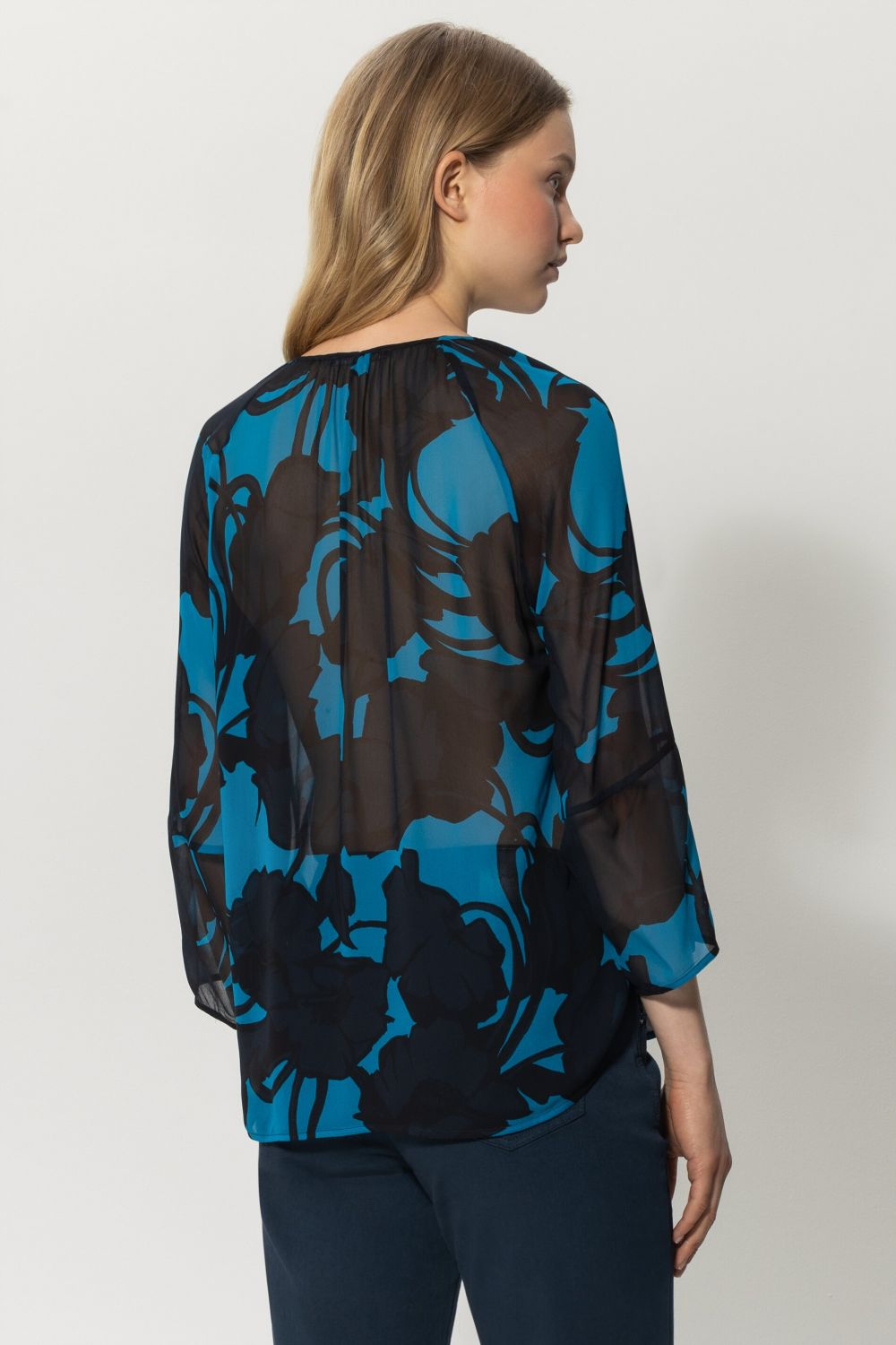 Легкая блузка из полупрозрачного вискозного крепа с эксклюзивным абстрактным цветочным мотивом. Вырез с фестонами и рукава длиной ¾ завершают образ.
