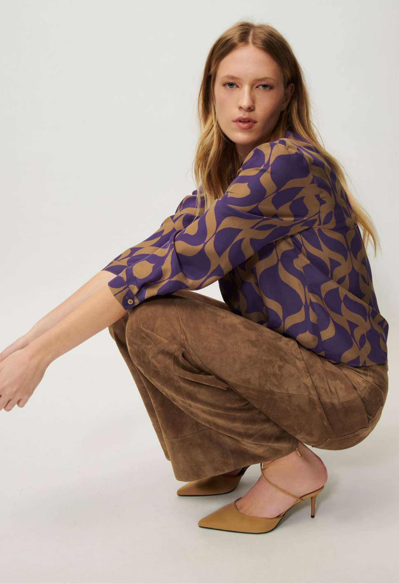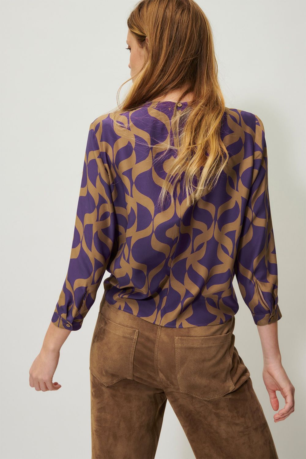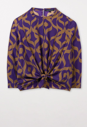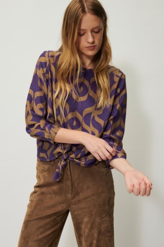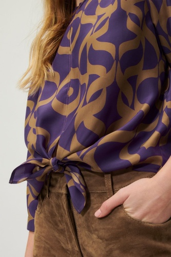 Блузка из плотного шелка с рукавами длиной ¾, разрезом на горловине и изысканным узлом по низу. Блуза украшена эксклюзивным графическим принтом по всей поверхности.